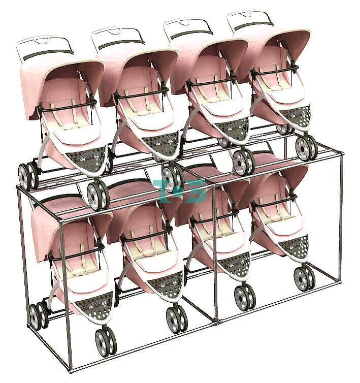 - на верхнем ярусе продольные хромированные трубы под колеса детской коляски;