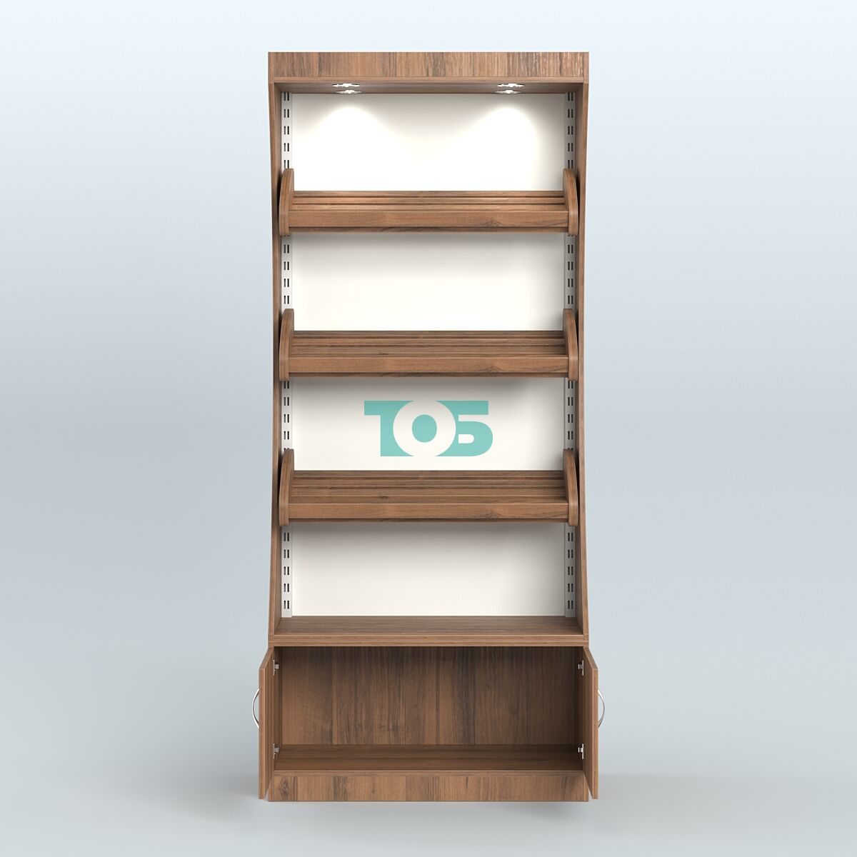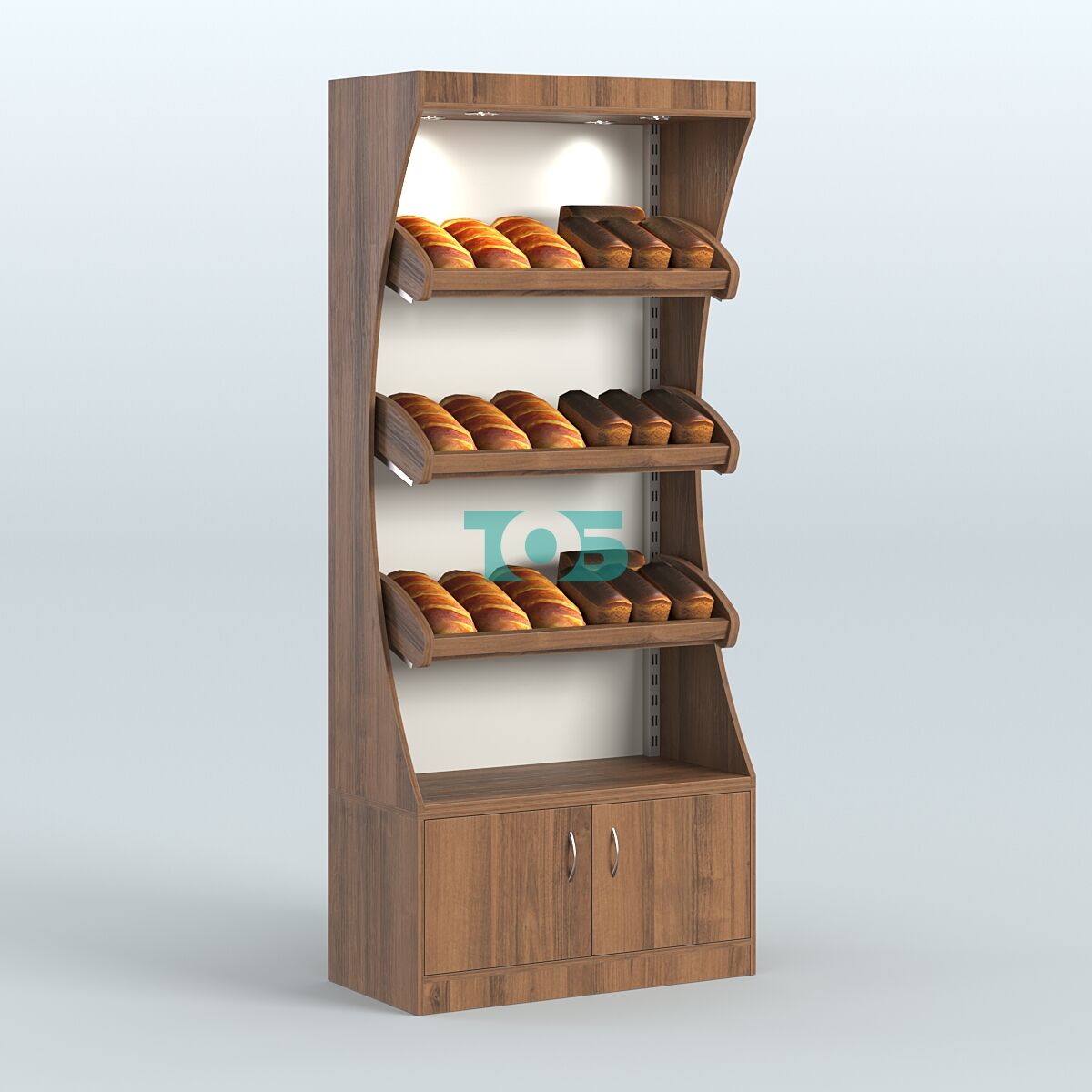 Широкий стеллаж для продажи хлеба и выпечки с нижней корзиной - накопителем и зеркальным фризом СХНФ-02