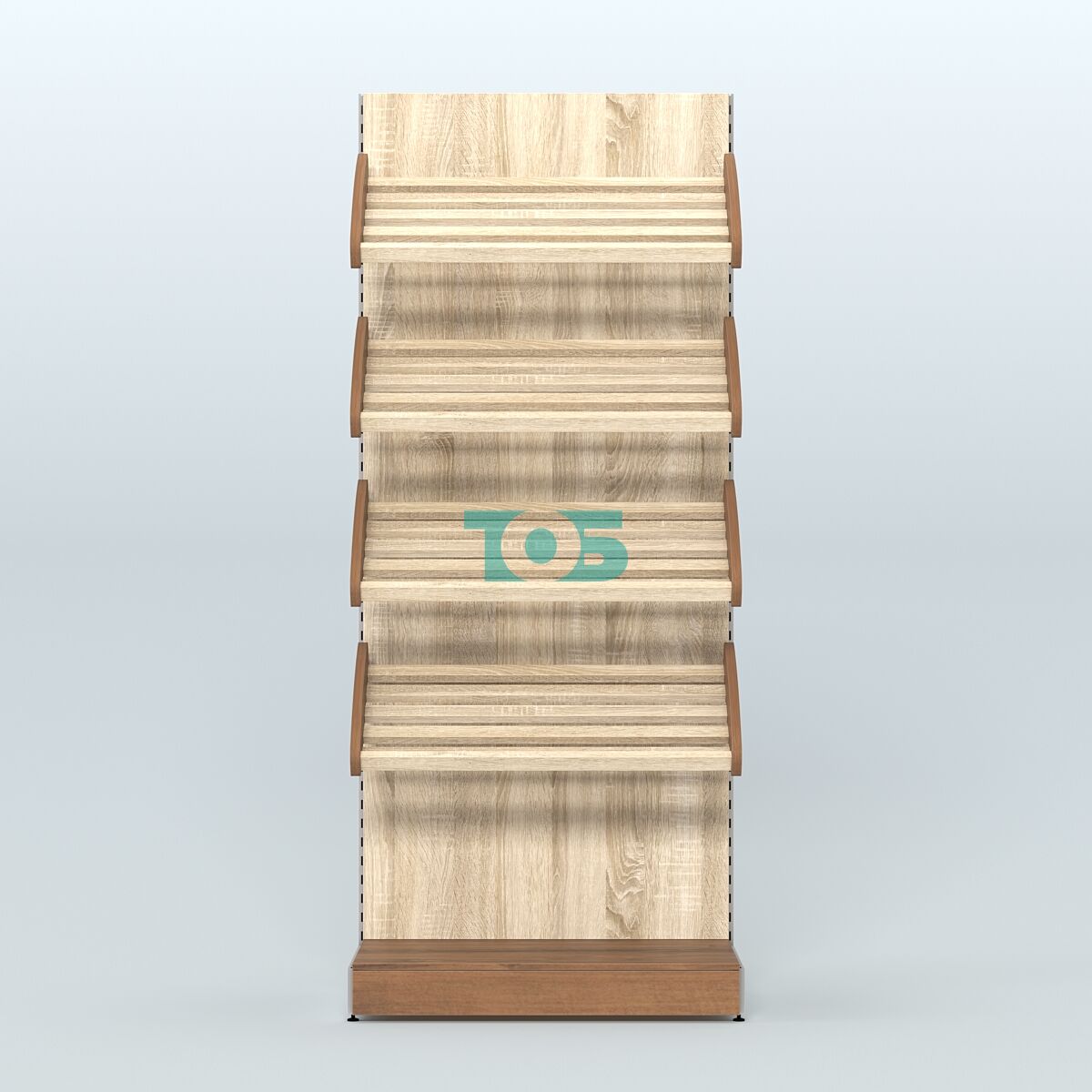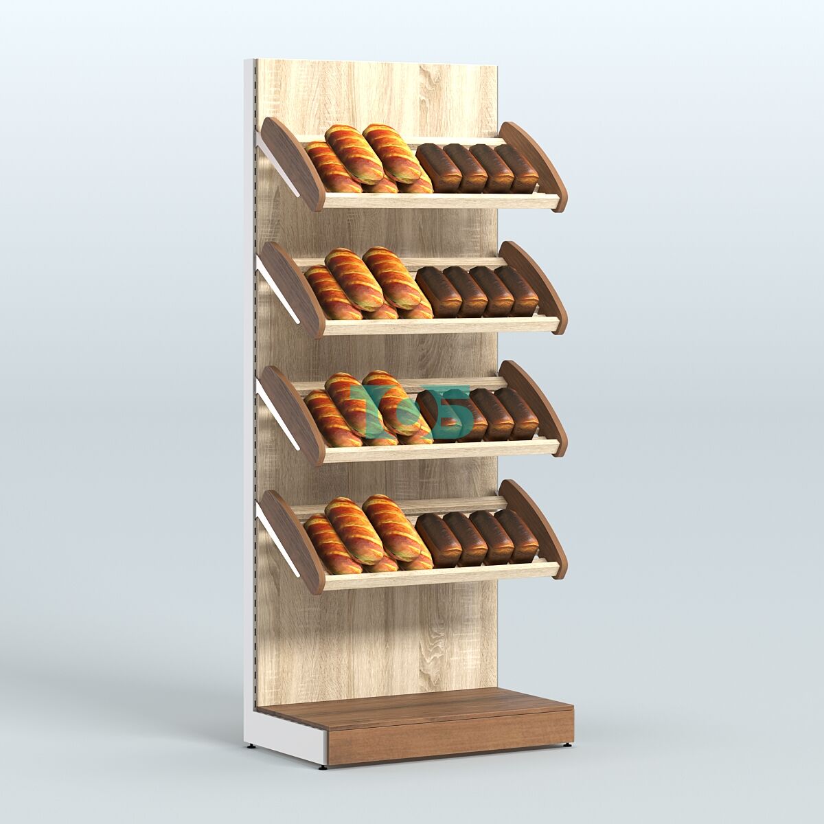 Широкий стеллаж для продажи хлеба и выпечки с нижней корзиной - накопителем и зеркальным фризом СХНФ-02