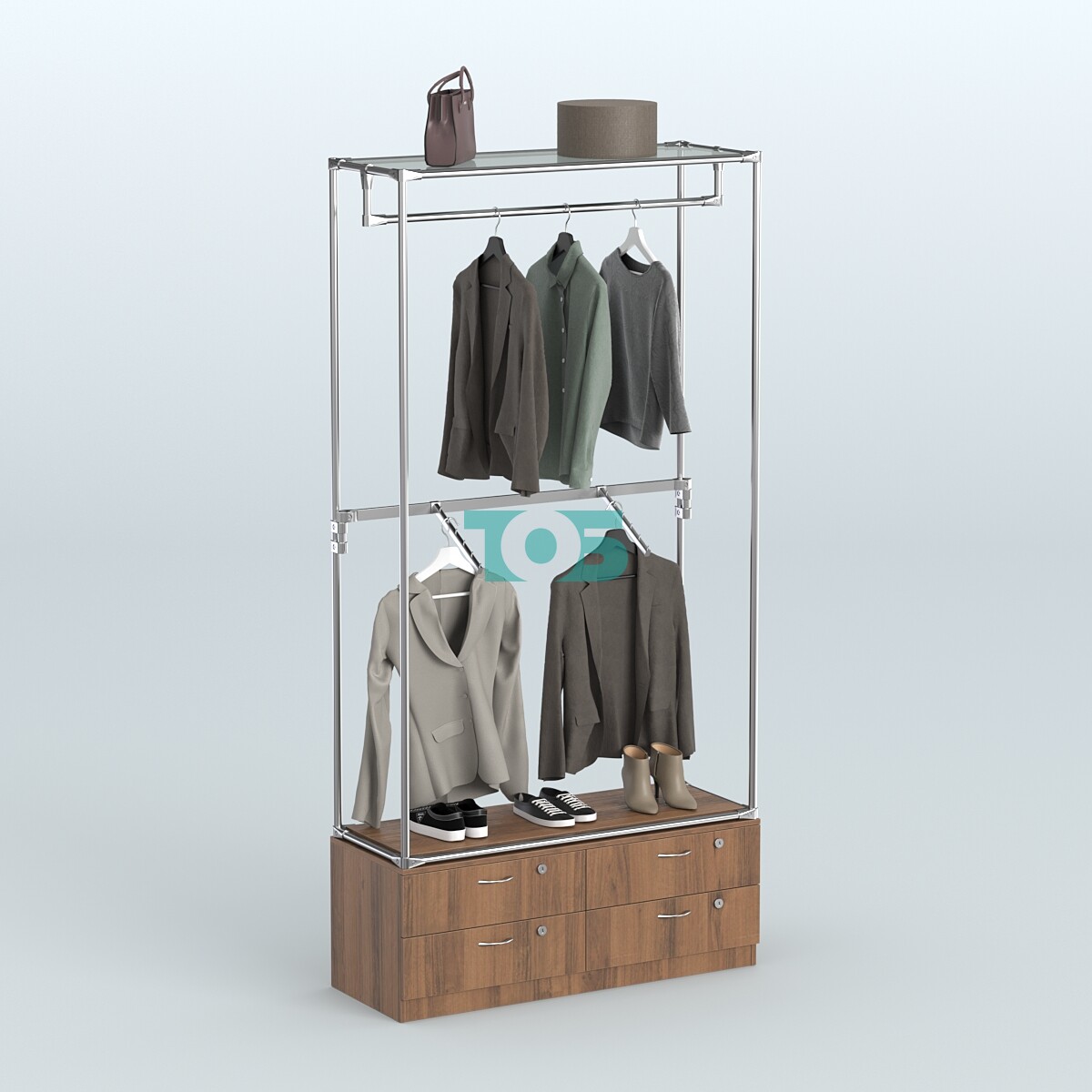 Поручни: один продольный поручень и один пристенный поручень предназначены для размещения одежды, что делает систему удобной в использовании.