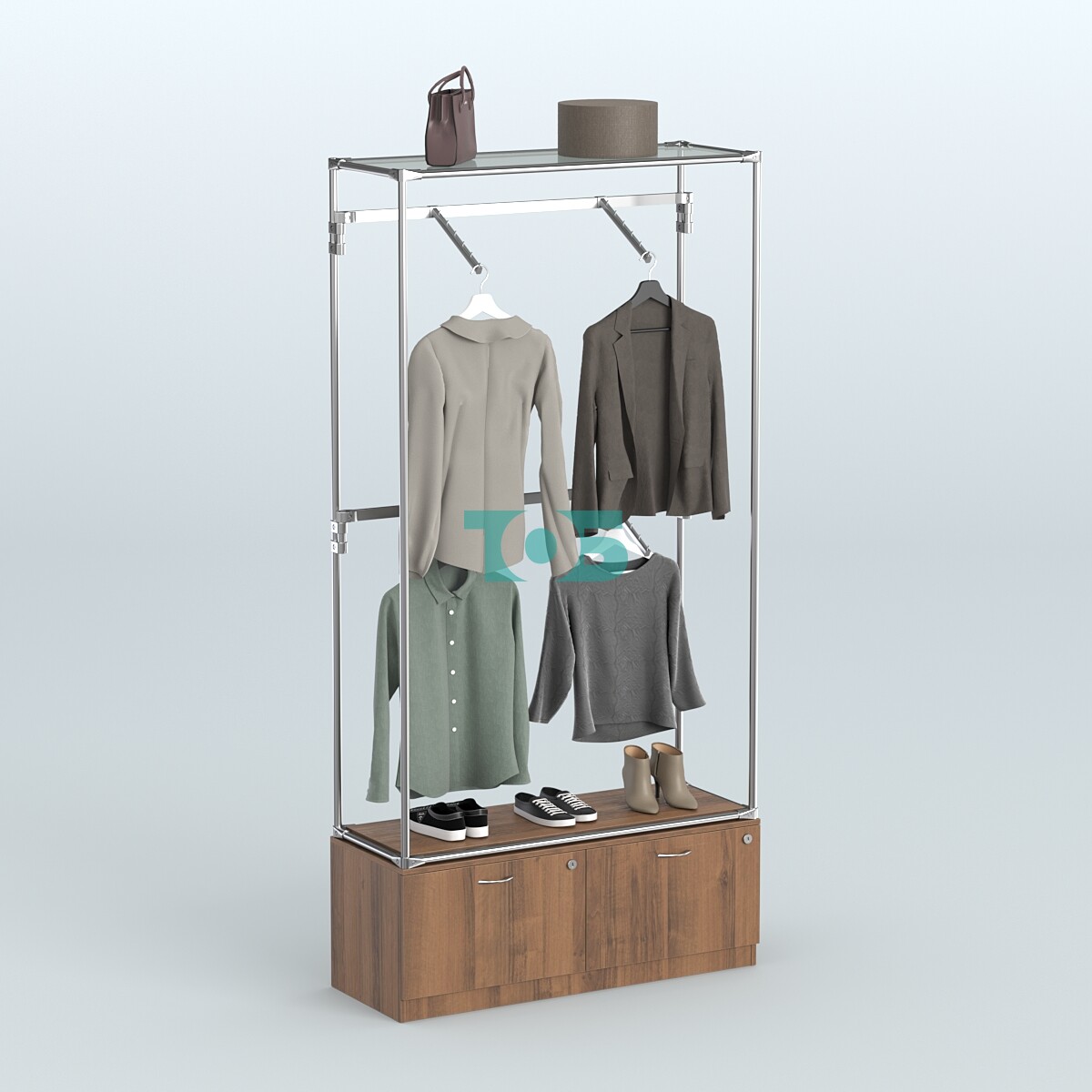 Торговая система ХРОМ без ДСП 1200 мм №3-3 с тумбой Т-15 и поручнями представляет собой удобное и функциональное решение для организации пространства в торговых залах, офисах и других помещениях. Благодаря своей конструкции и качественным материалам система обеспечивает долговечность и эстетическую привлекательность.
