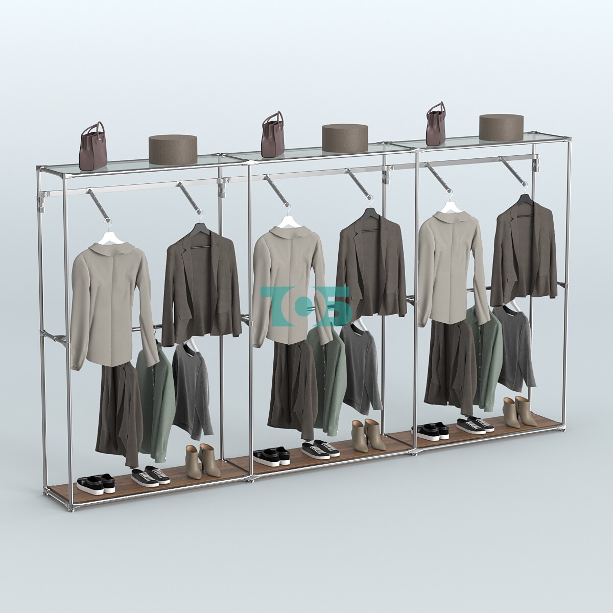 Задняя стенка: отсутствует, что способствует визуальному расширению пространства и облегчает доступ к системе с разных сторон.