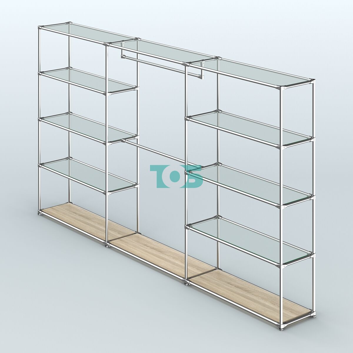 Отличия модели торговой системы ХРОМ без ДСП 3600 мм с прозрачными полками и поручнями №1: