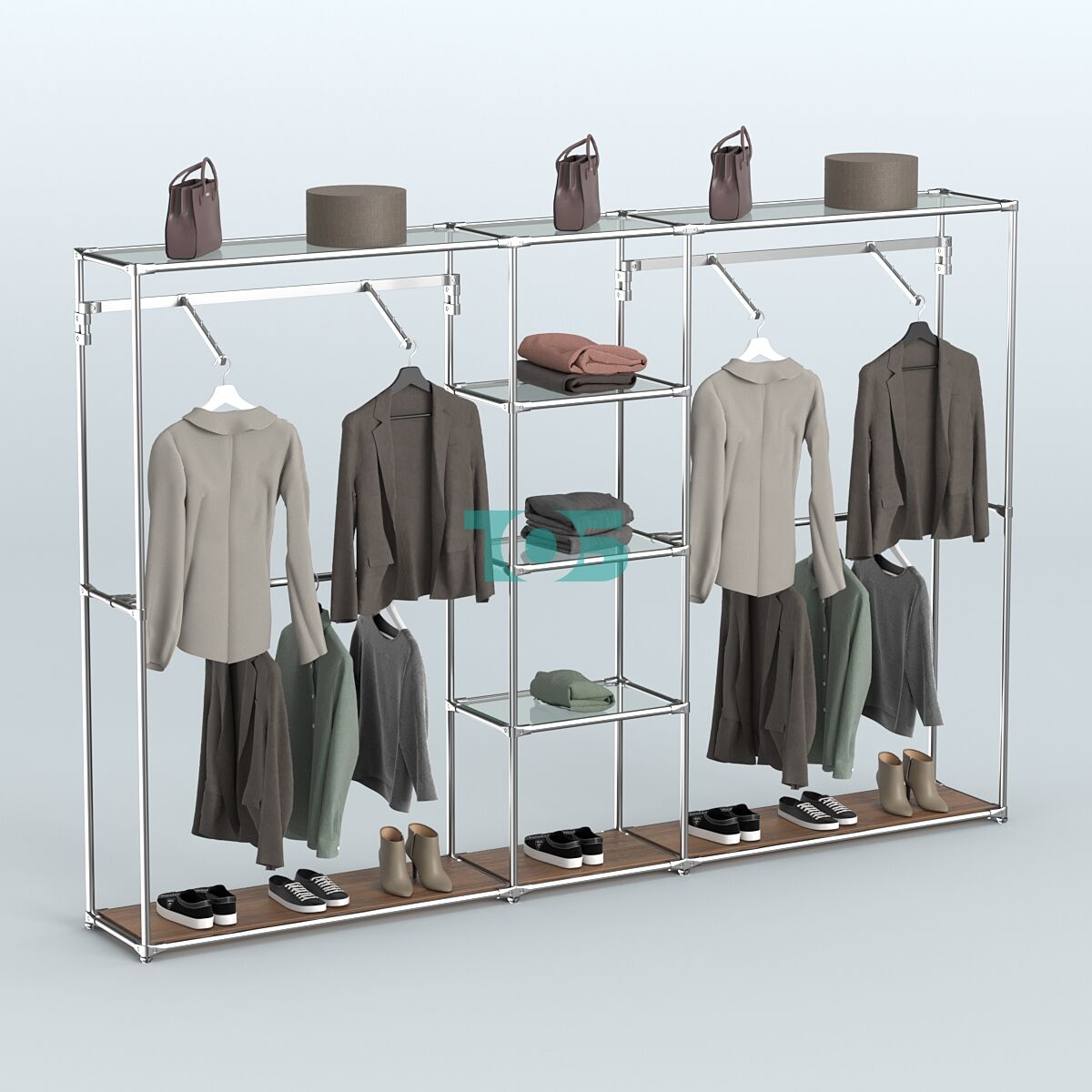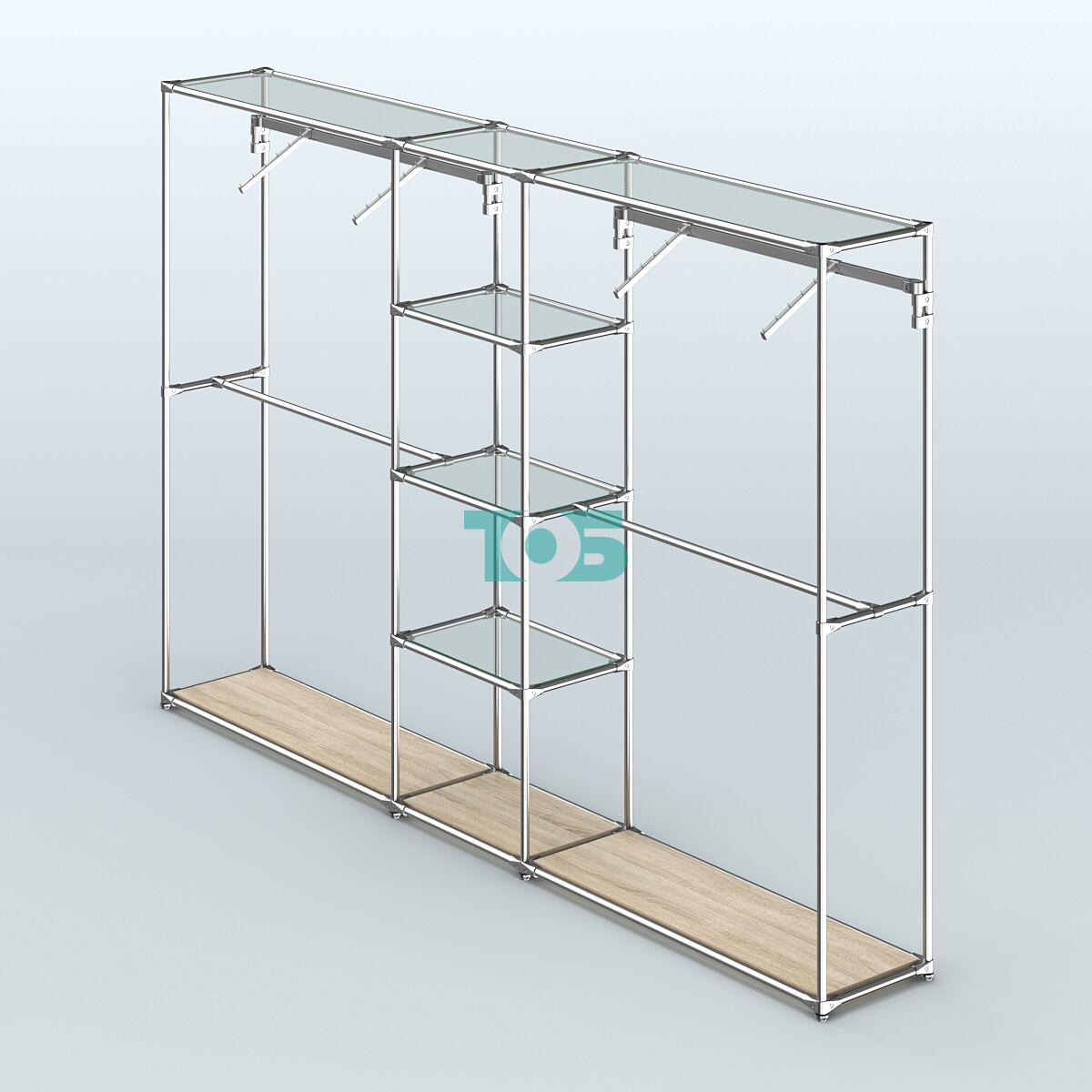 Отличия модели торговой системы ХРОМ без ДСП 3030 мм с прозрачными полками и поручнями №12:
