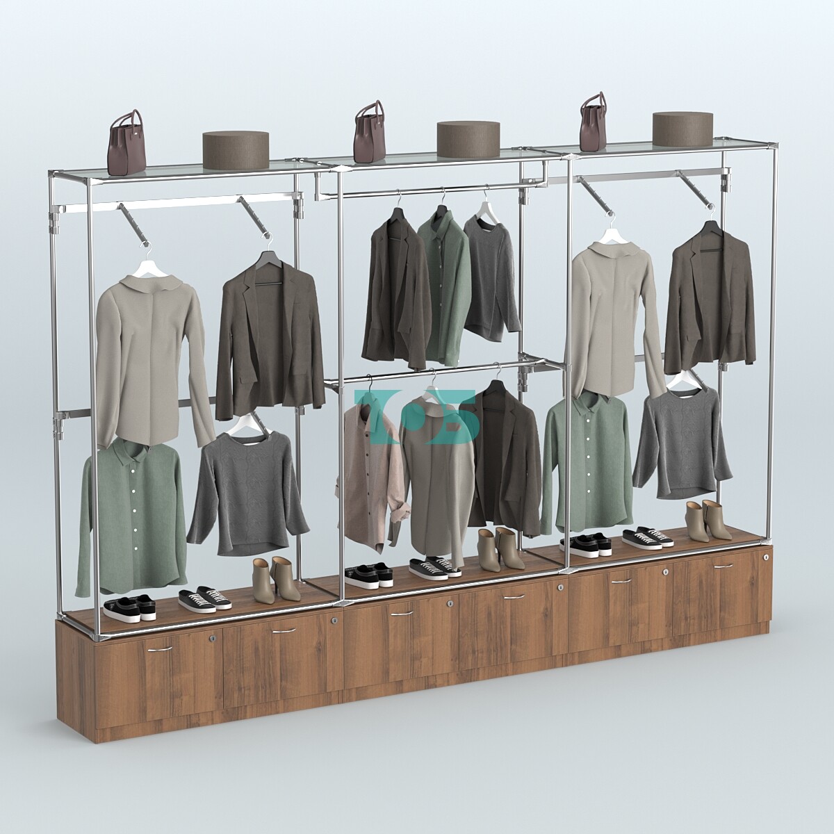 Поручни: система оснащена поручнями для одежды в трёх блоках: в левом и правом блоках по два пристенных поручня, а в центральном блоке — два продольных поручня. Это обеспечивает удобство хранения вещей и их доступность.