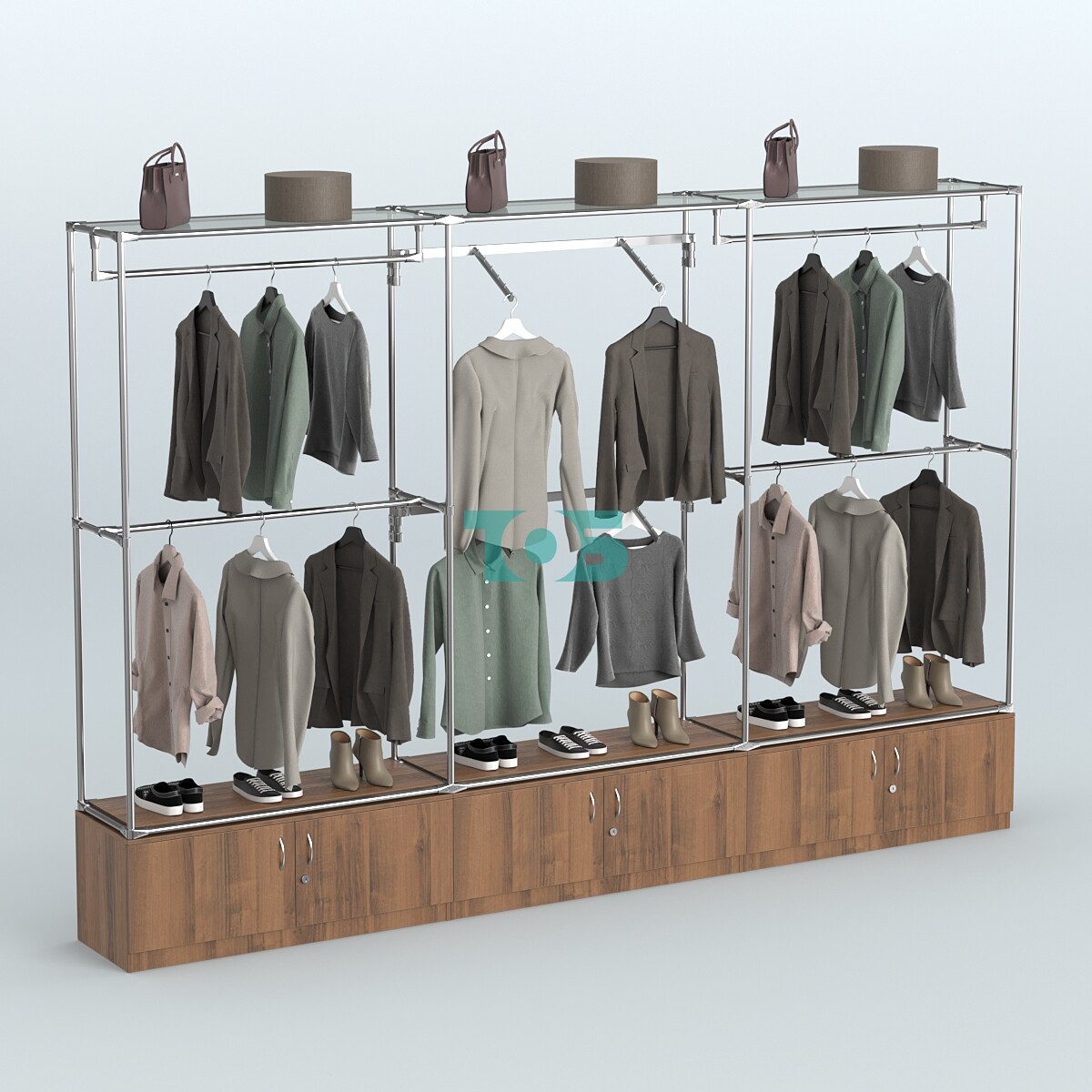 Поручни: система оснащена поручнями для одежды в трёх блоках: в левом и правом блоках по два продольных поручня, а в центральном блоке — два пристенных поручня. Это обеспечивает удобство хранения вещей и их доступность.