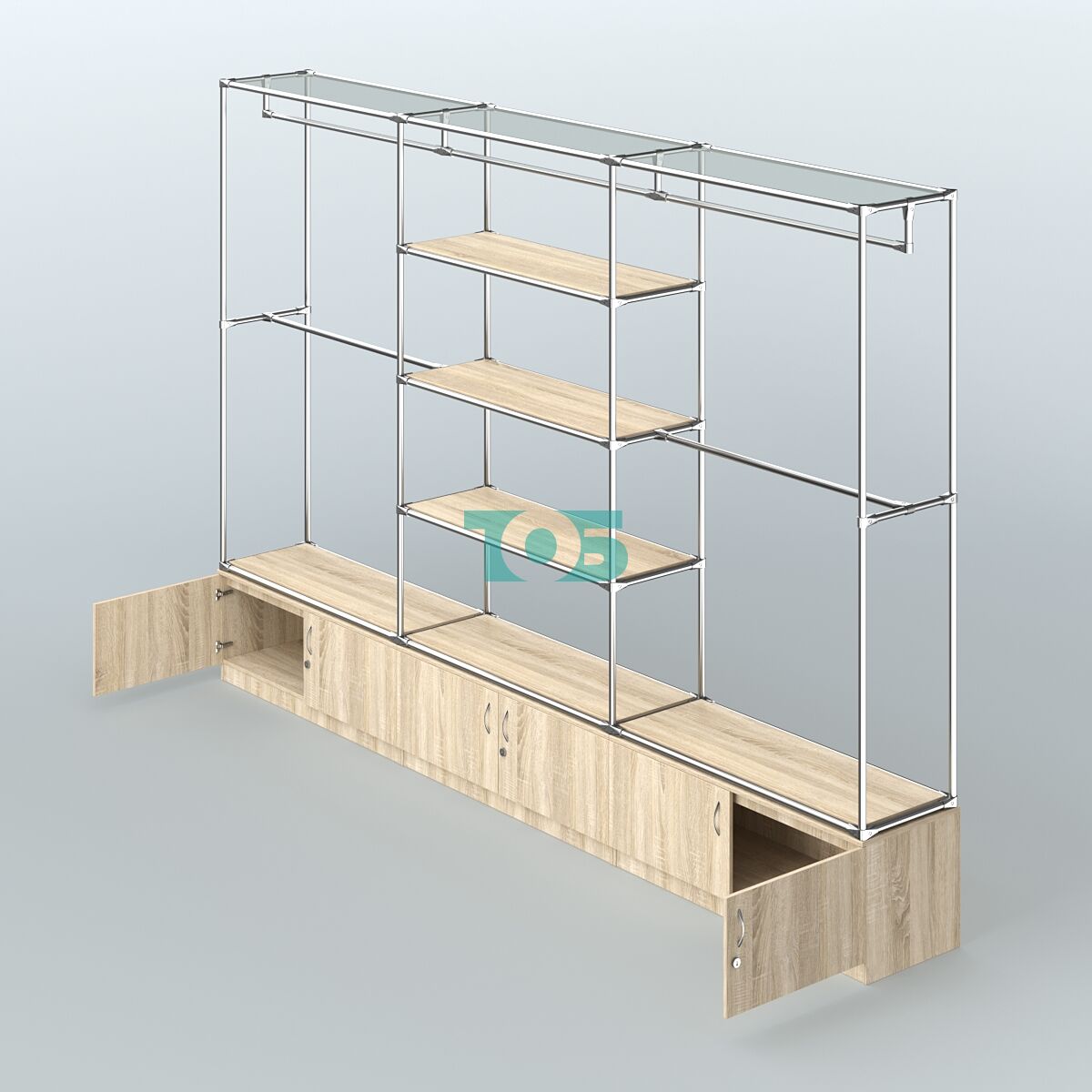 Отличия модели торговой системы ХРОМ без ДСП 3600 мм с тумбами Т21, полками ДСП и поручнями №2: