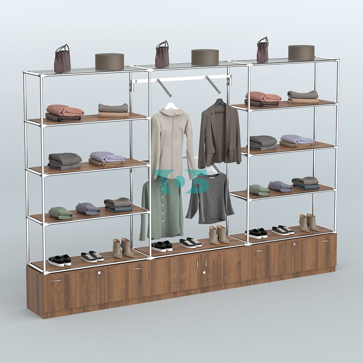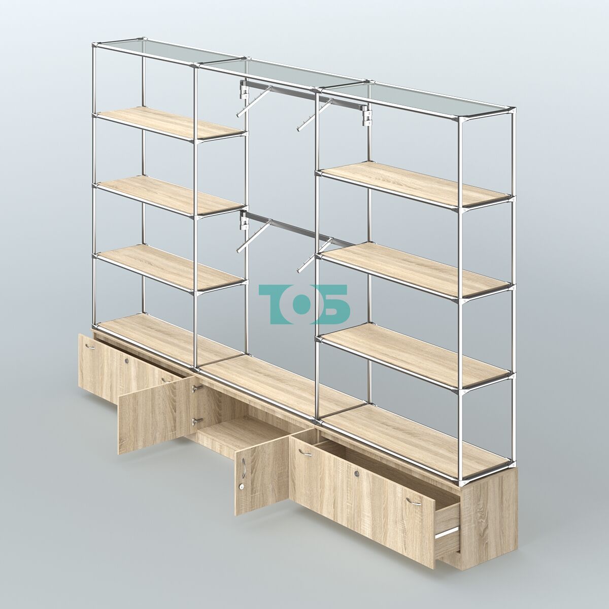 Отличия модели торговой системы ХРОМ без ДСП 3600 мм с тумбами Т11, Т21, полками ДСП и поручнями №4:
