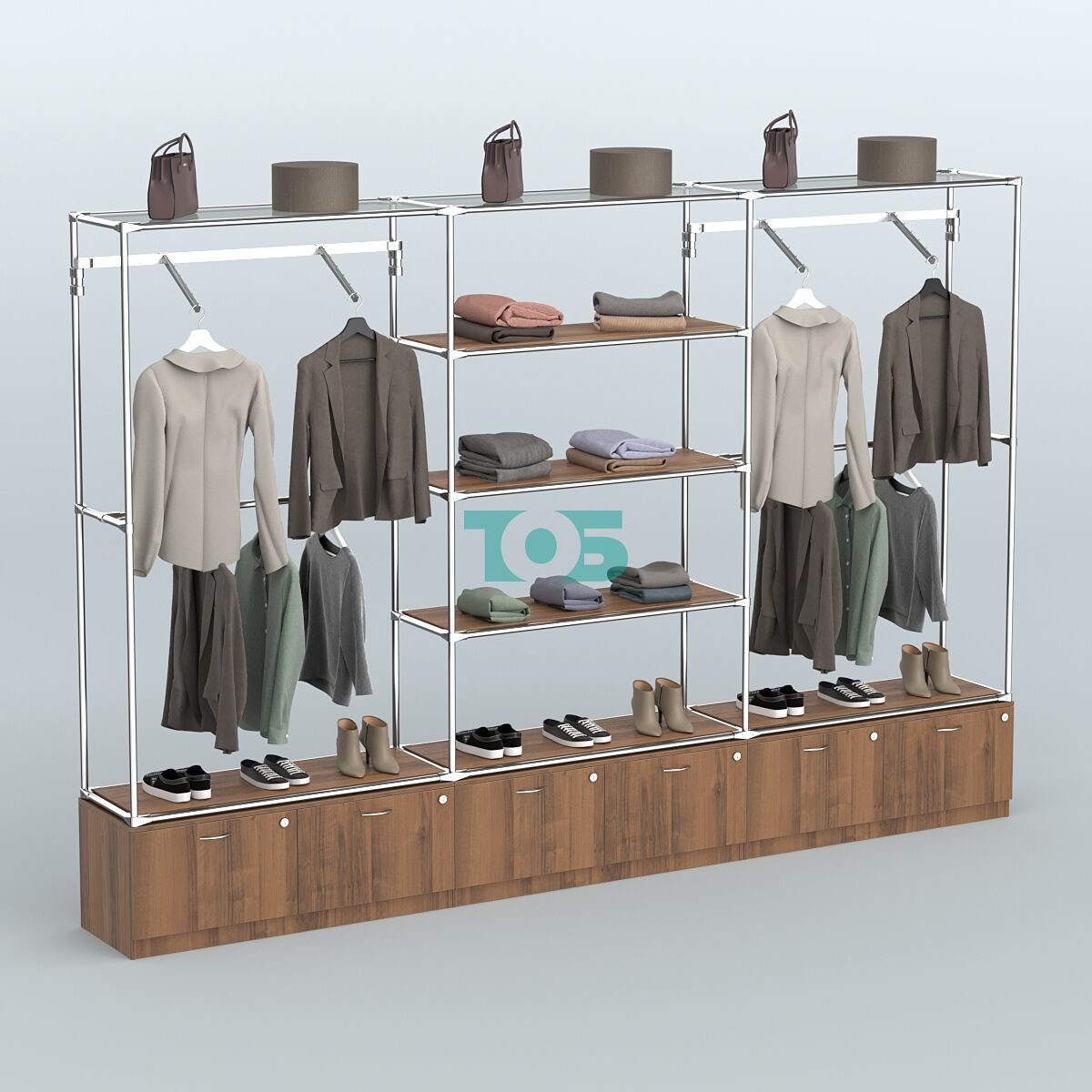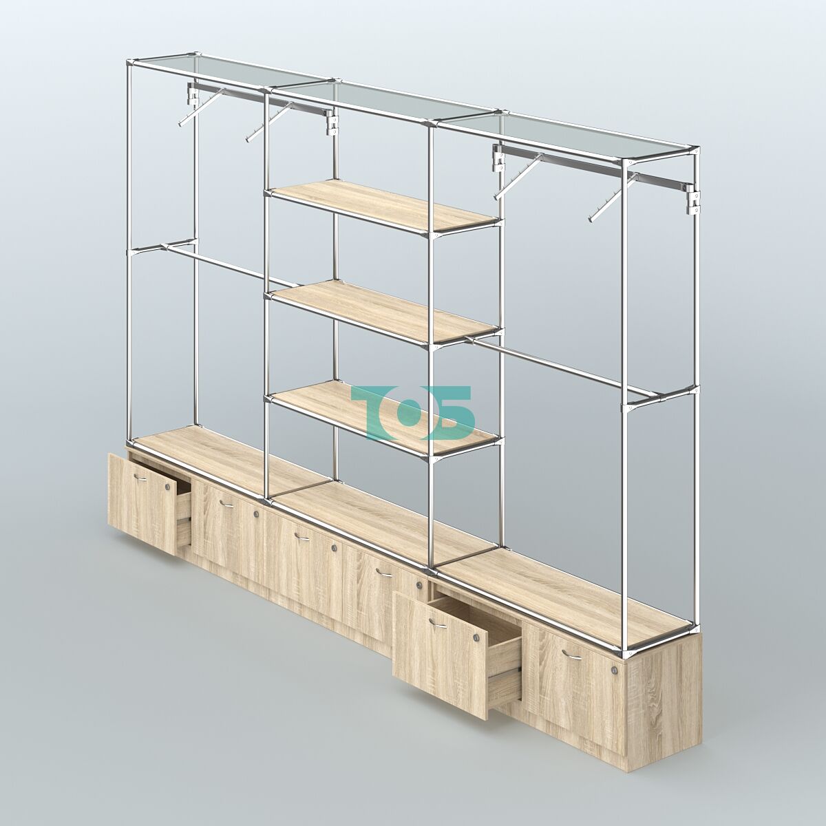 Отличия модели торговой системы ХРОМ без ДСП 3600 мм с тумбами Т15, полками ДСП и поручнями №6: