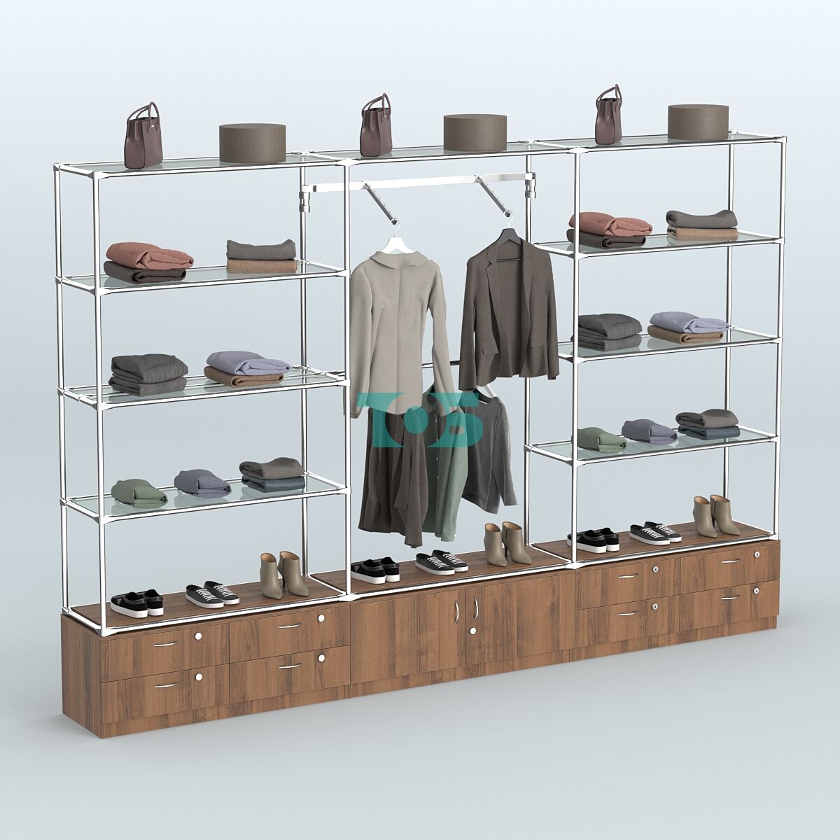 - в левом блоке три стеклянные полки для одежды;