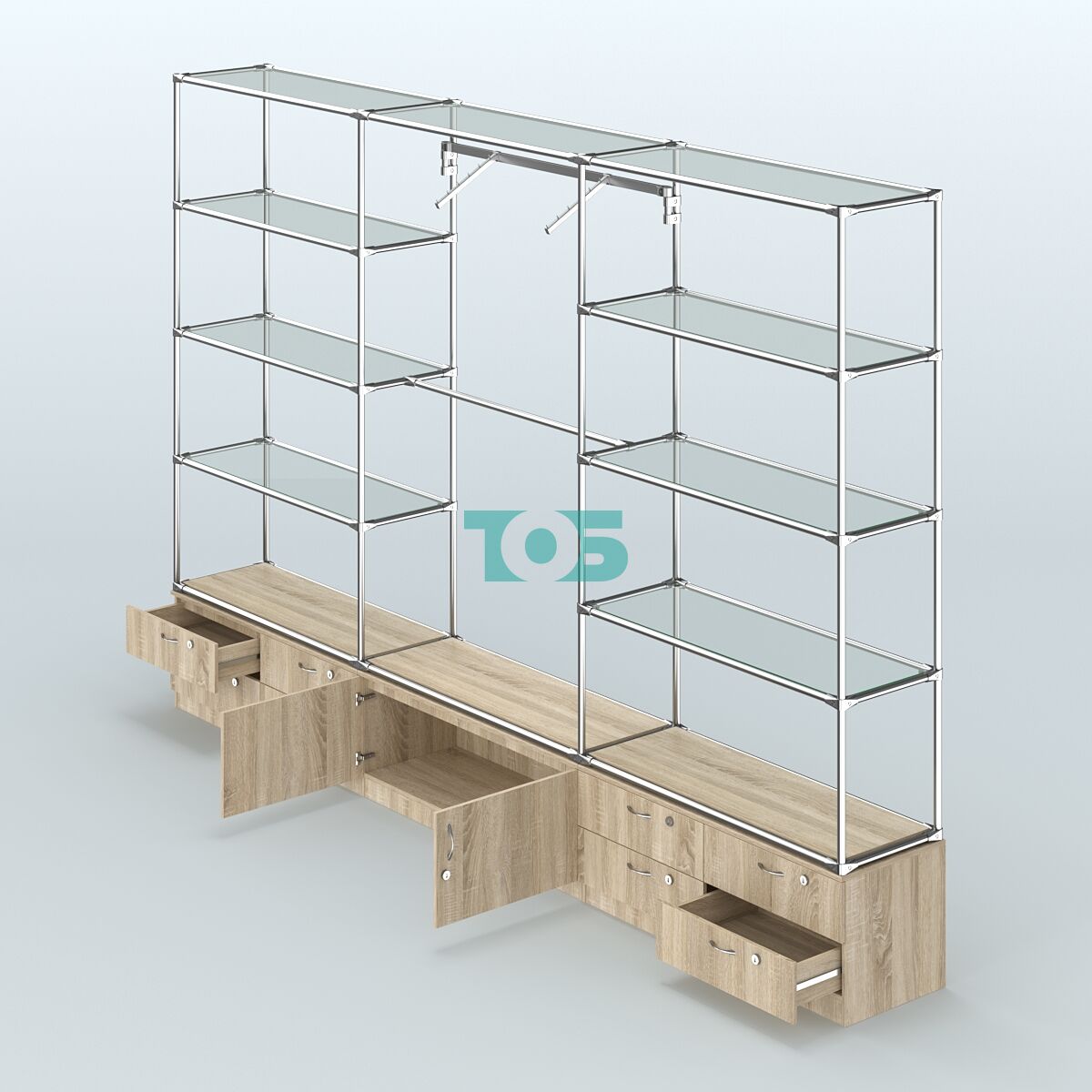 Отличия модели торговой системы ХРОМ без ДСП 3600 мм с тумбами т-14,т-21 и прозрачными полками и поручнями №5: