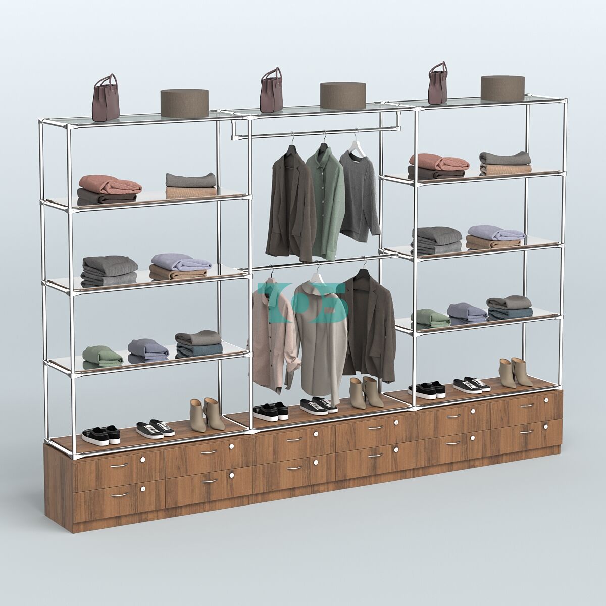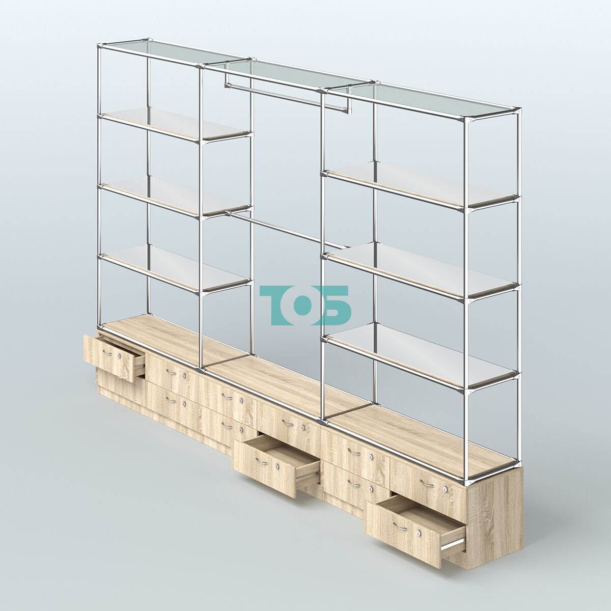 Отличия модели торговой системы ХРОМ без ДСП 3600 мм с тумбами Т14, зеркальными полками и поручнями №1: