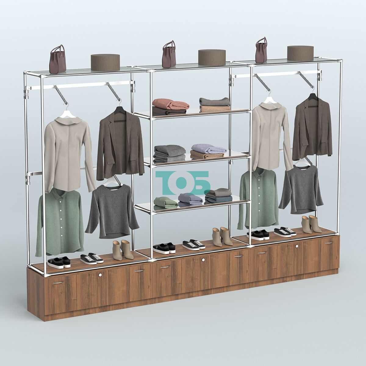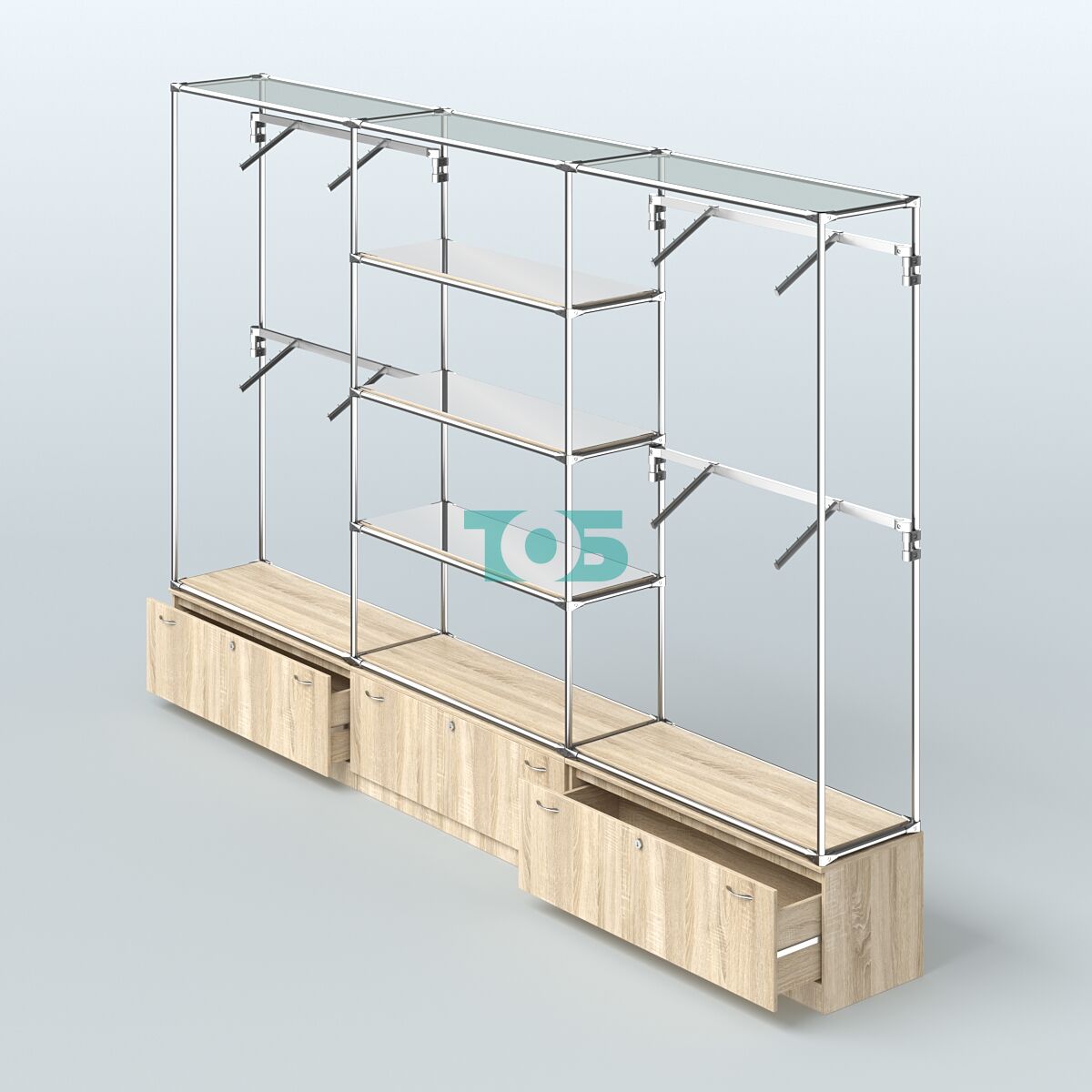 Отличия модели торговой системы ХРОМ без ДСП 3600 мм с тумбами Т11, зеркальными полками и поручнями №3: