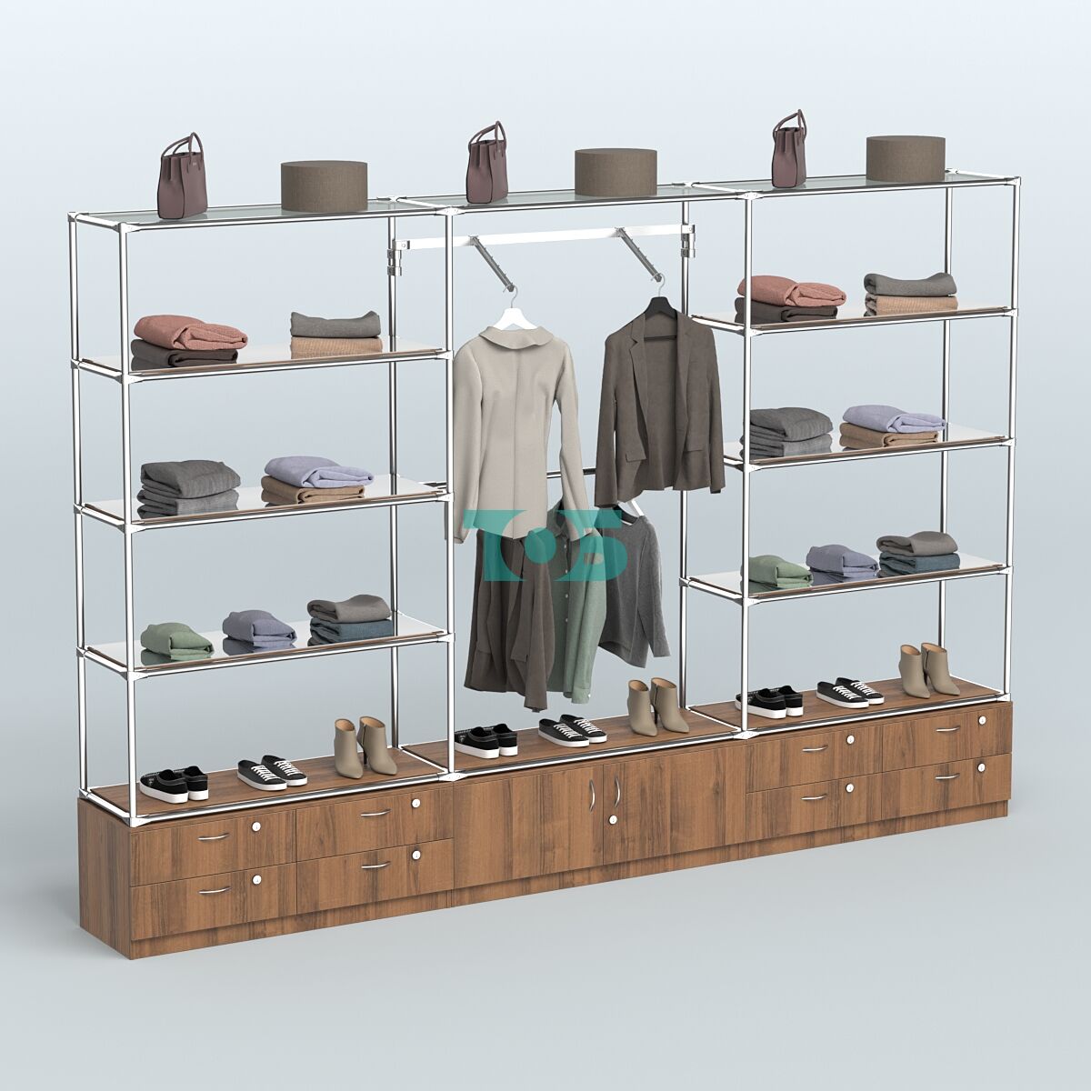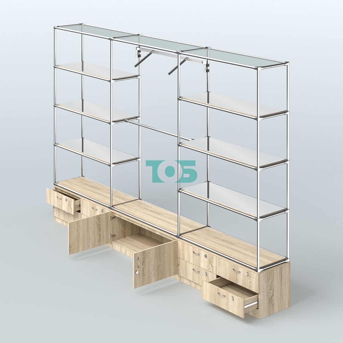 Отличия модели торговой системы ХРОМ без ДСП 3600 мм с тумбами Т14, Т21, зеркальными полками и поручнями №5:
