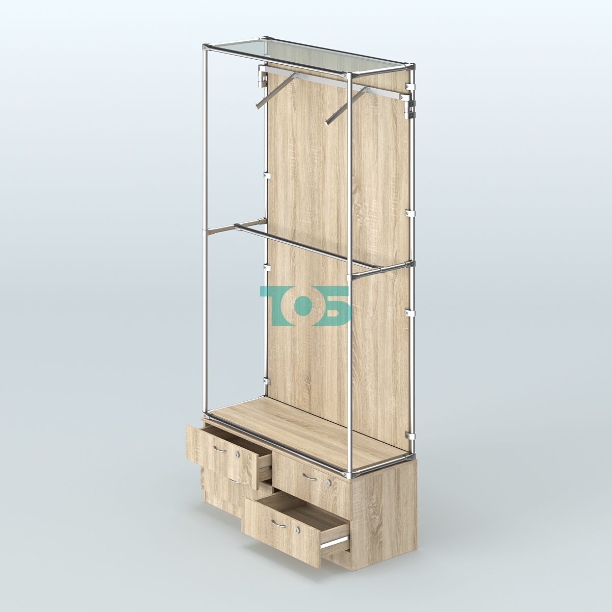 Тумба: оснащена четырьмя выдвижными ящиками, что предоставляет дополнительное пространство для хранения мелких предметов и улучшает организацию рабочего или торгового пространства.