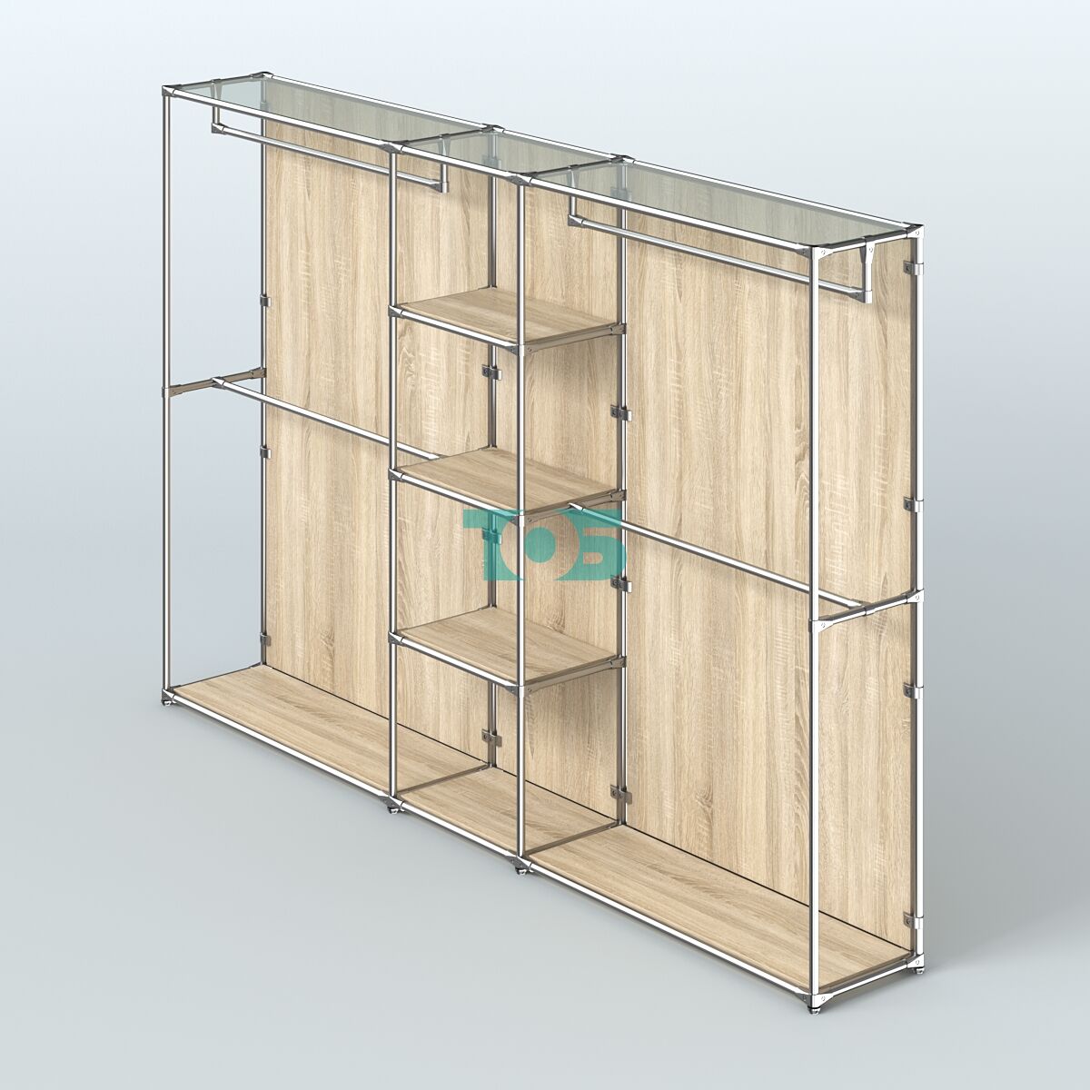 Отличия модели торговой системы ХРОМ (задняя стенка - ДСП) 3030 мм с полками ДСП и поручнями №4: