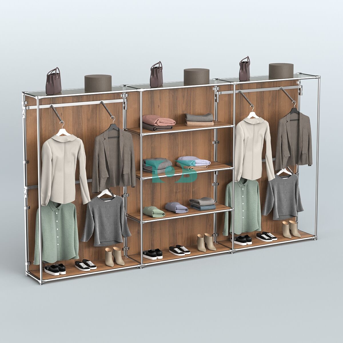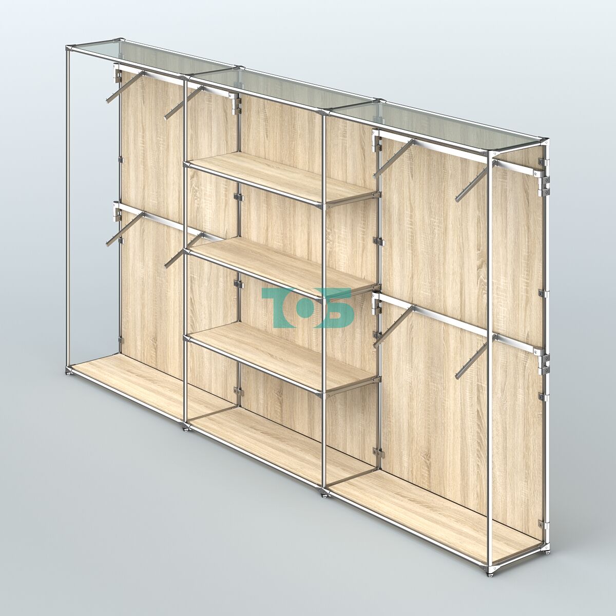 Отличия модели торговой системы ХРОМ (задняя стенка - ДСП) 3600 мм с полками ДСП и поручнями №5: