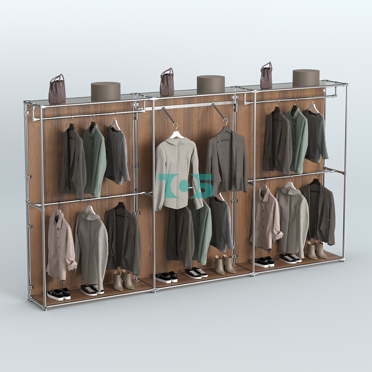 в правом блоке — два продольных поручня для одежды. Это обеспечивает удобство хранения и доступа к вещам.