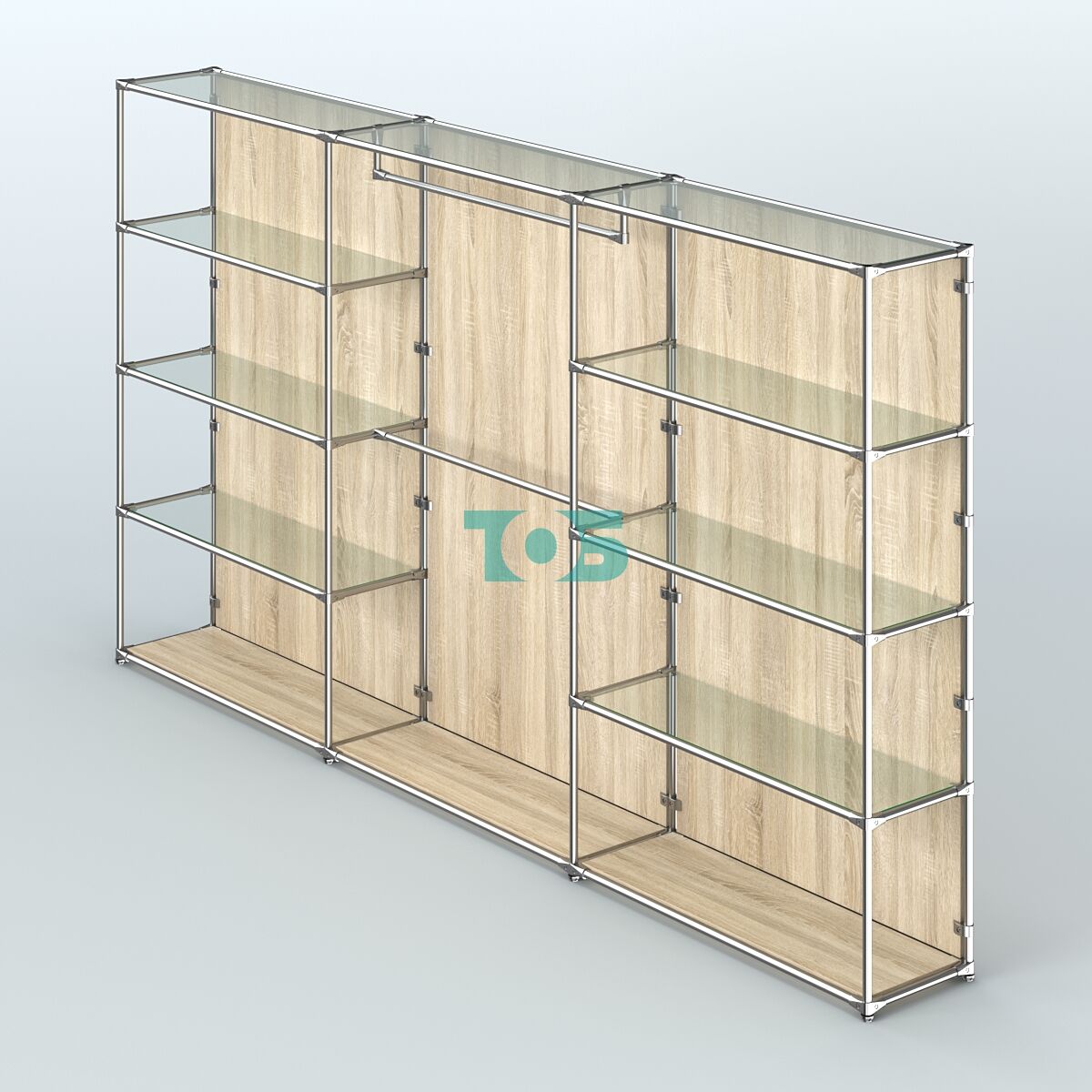 Отличия модели торговой системы ХРОМ (задняя стенка - ДСП) 3600 мм с прозрачными полками и поручнями №1: