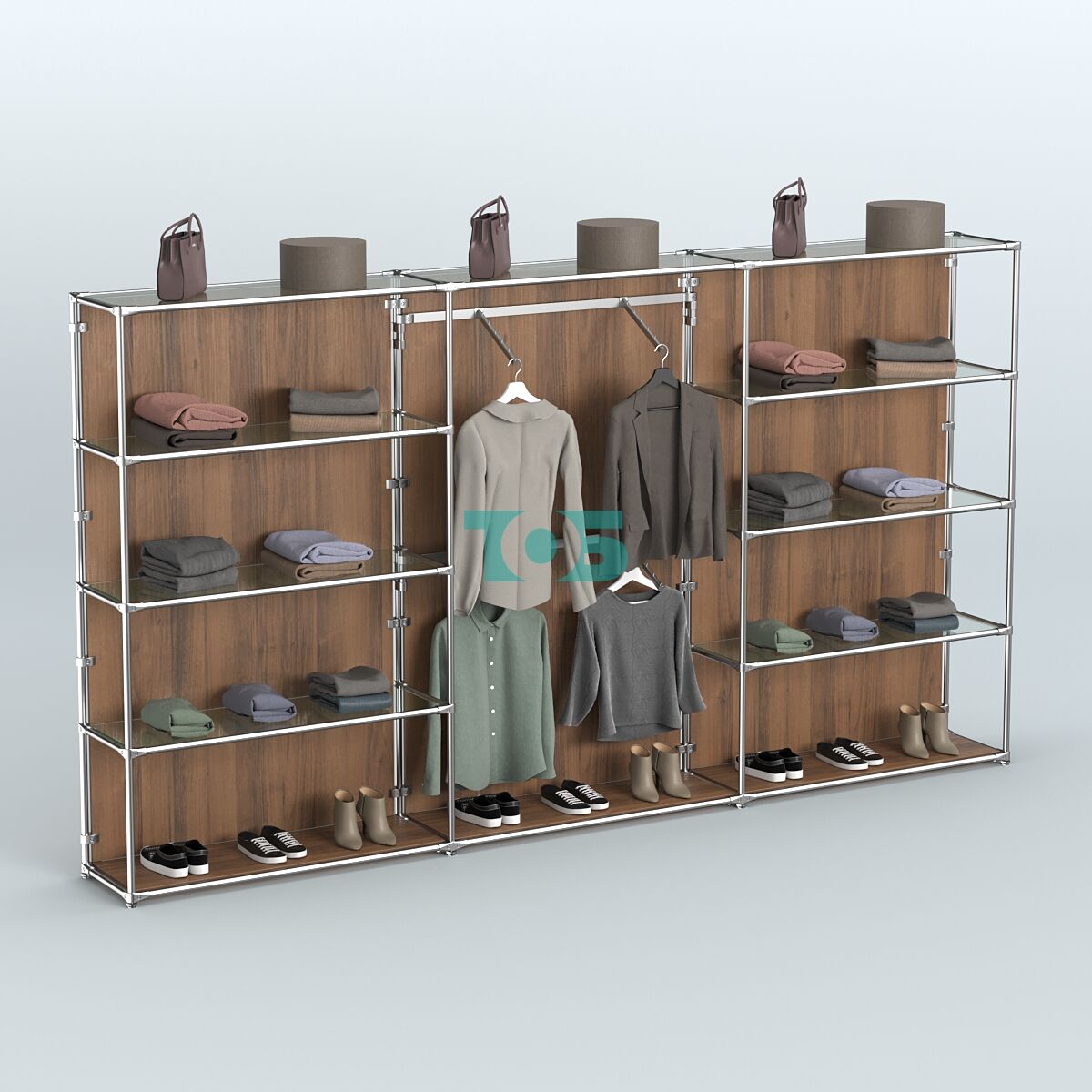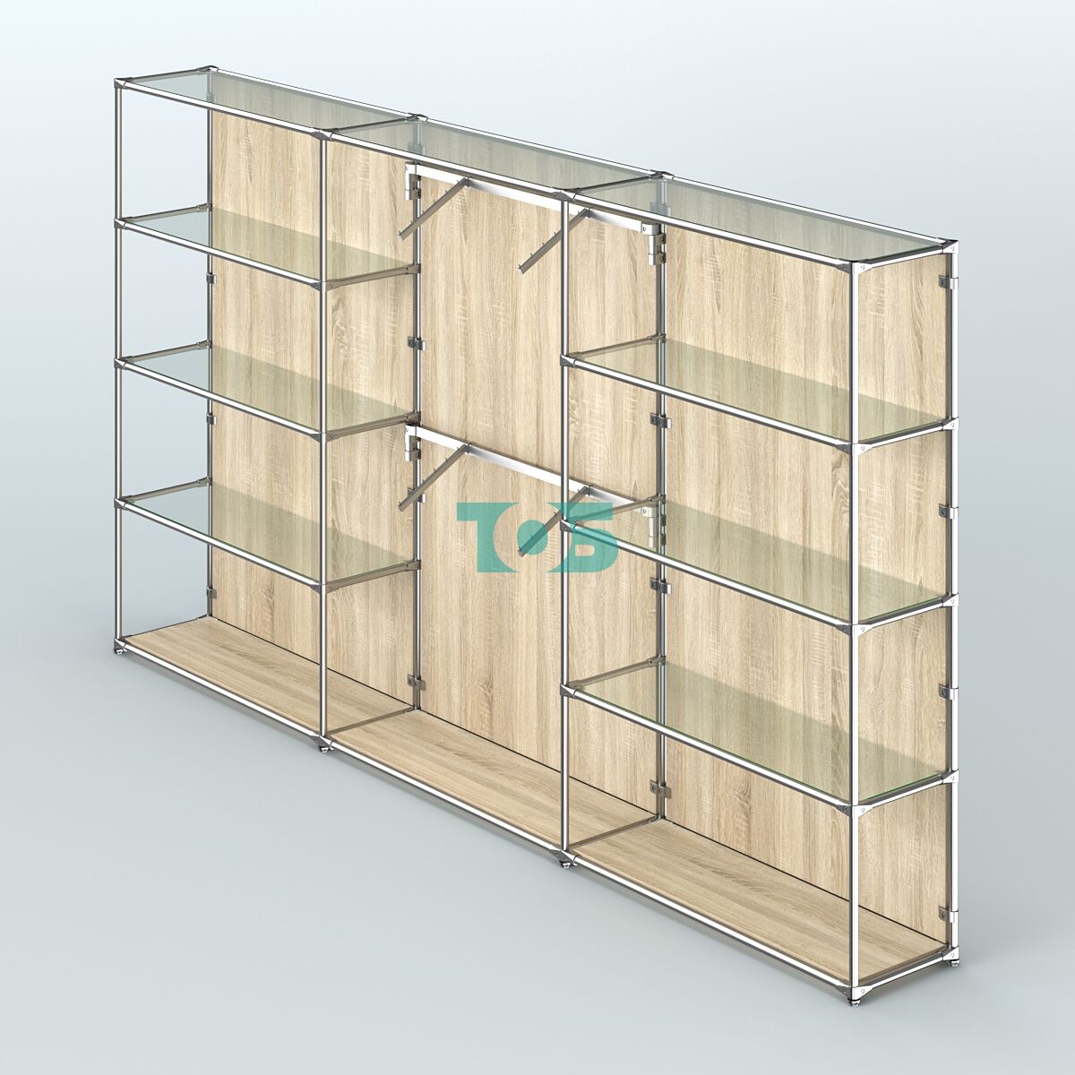 Отличия модели торговой системы ХРОМ (задняя стенка - ДСП) 3600 мм с прозрачными полками и поручнями №6: