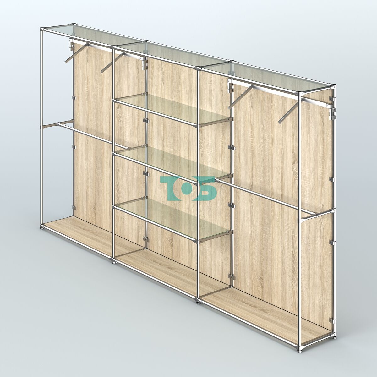 Отличия модели торговой системы ХРОМ (задняя стенка - ДСП) 3600 мм с прозрачными полками и поручнями №10: