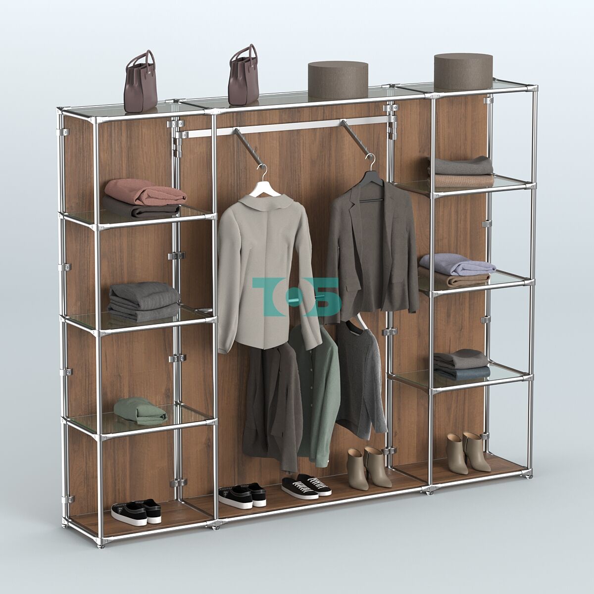 Отличия модели торговой системы ХРОМ (задняя стенка - ДСП) 2430 мм с прозрачными полками и поручнями №11: