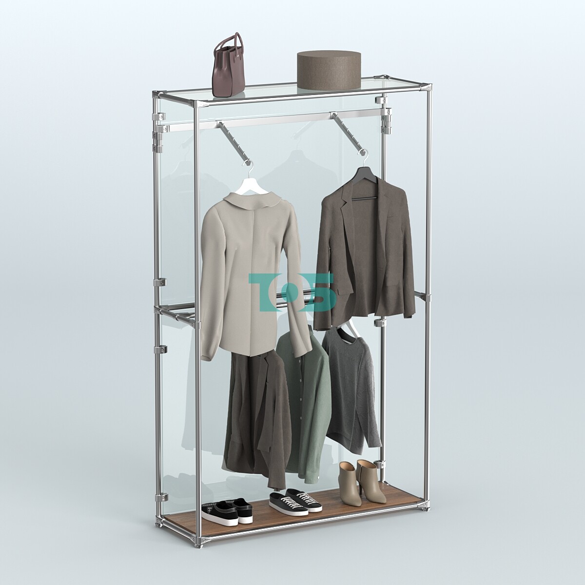 Поручни: включает один пристенный и один продольный поручень для удобного размещения одежды и других товаров.