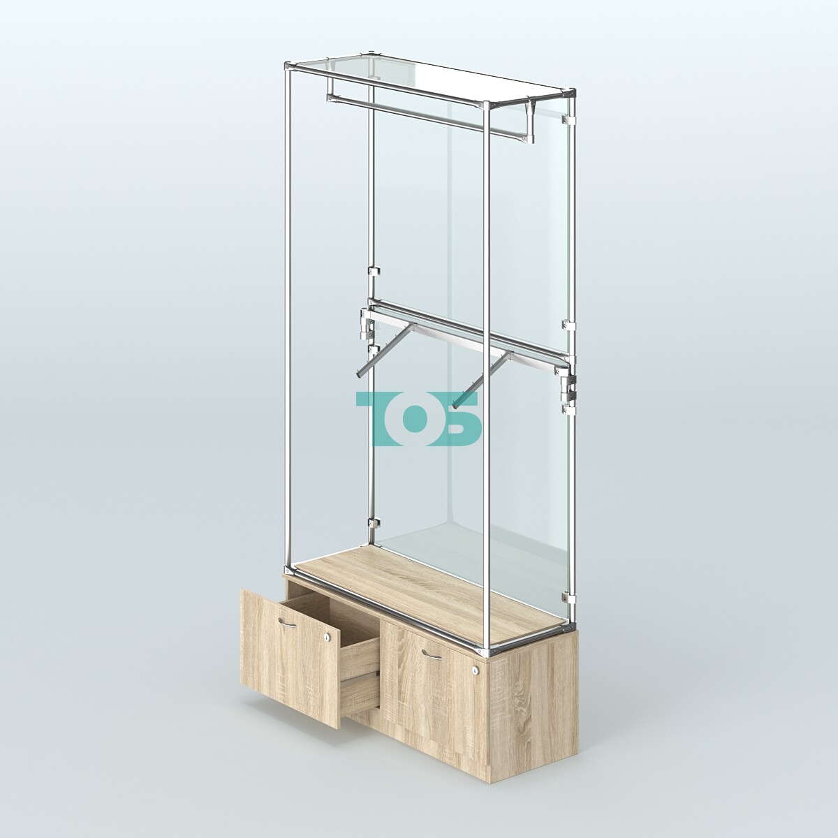 Торговая система ХРОМ с задней стенкой из стекла, модель №2-3 с тумбой Т-15 и поручнями — это стильное и функциональное решение для организации пространства в торговых залах, офисах и других помещениях. Система сочетает в себе удобство использования и долговечность благодаря продуманной конструкции и качественным материалам.