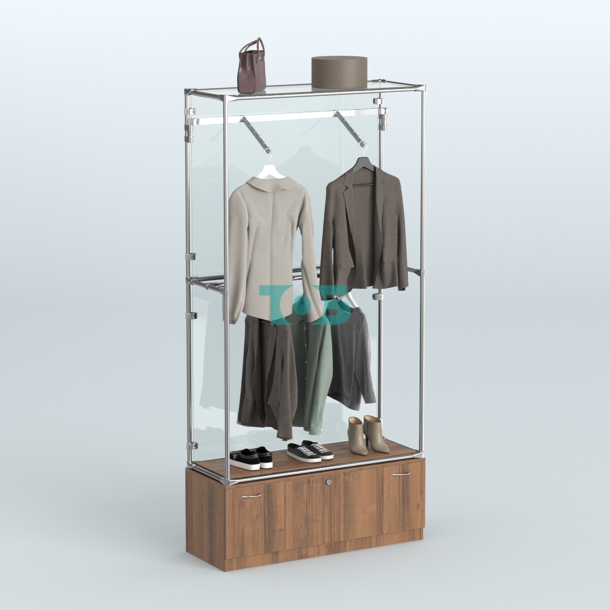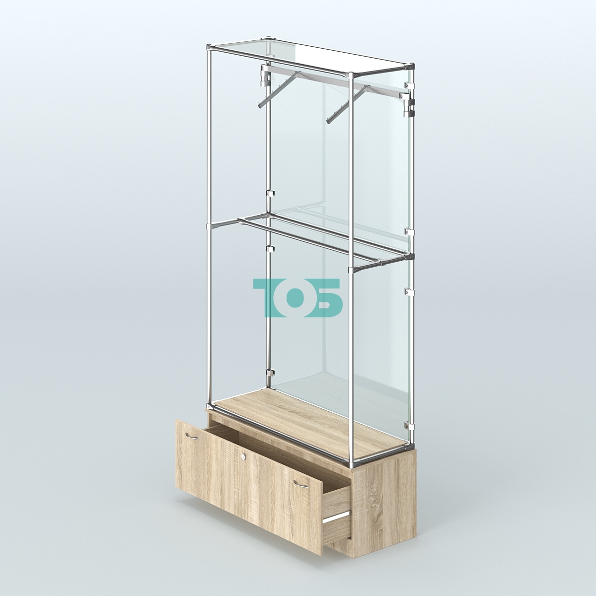 Торговая система ХРОМ с задней стенкой из стекла, модель №4-1 с тумбой Т-11 и поручнями — это стильное и функциональное решение для организации пространства в торговых залах, офисах и других помещениях. Система сочетает в себе удобство использования и долговечность благодаря качественным материалам и продуманной конструкции.