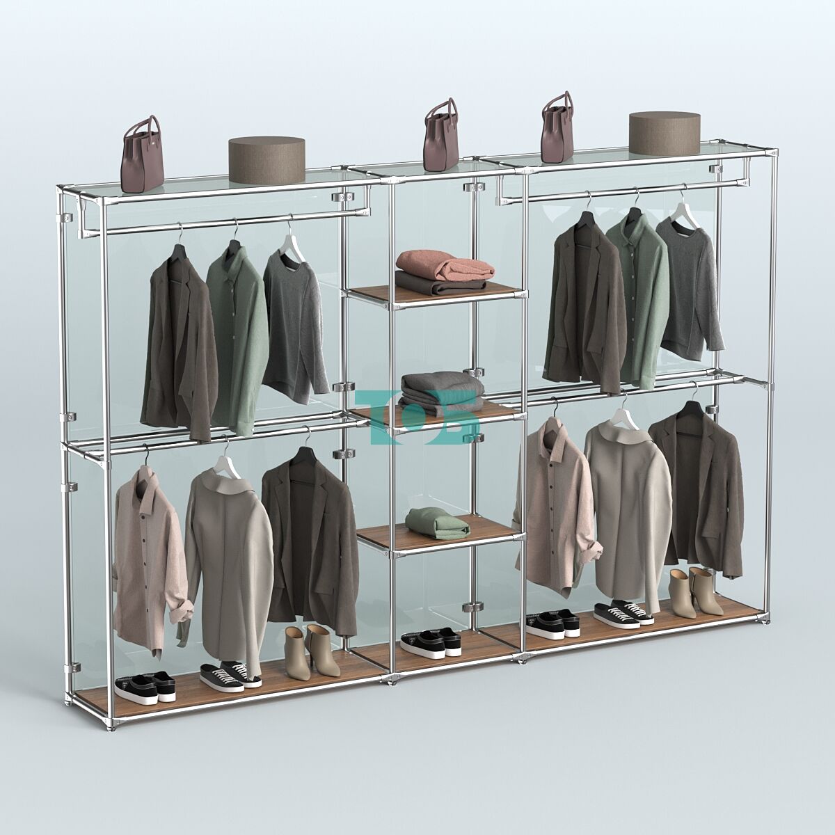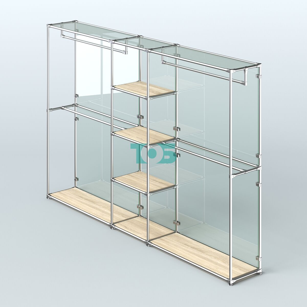 Отличия модели торговой системы ХРОМ (задняя стенка - стекло) 3030 мм с полками ДСП и поручнями №4: