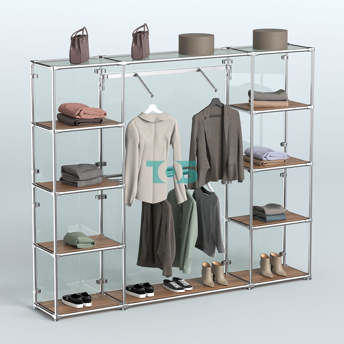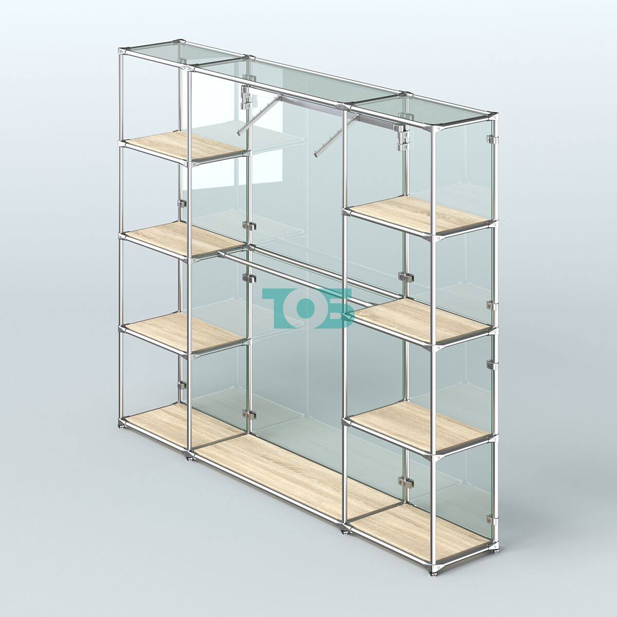 Отличия модели торговой системы ХРОМ (задняя стенка - стекло) 2430 мм с полками ДСП и поручнями №11: