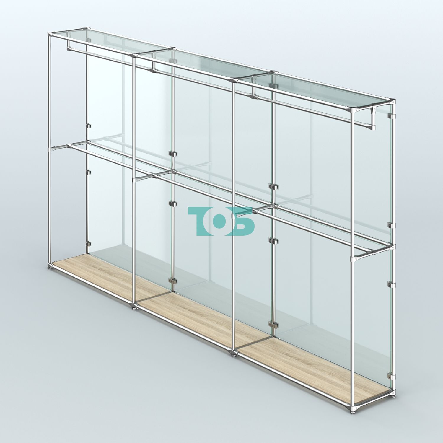 Торговая система ХРОМ с задней стенкой из стекла и поручнями №1 представляет собой современное и стильное решение для организации пространства в торговых залах, офисах и других помещениях. Благодаря своей конструкции и качественным материалам, система обеспечивает удобство использования и эстетически привлекательный вид.