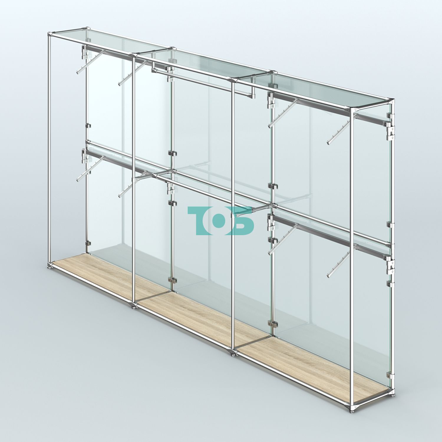Торговая система ХРОМ с задней стенкой из стекла и поручнями №2 представляет собой продуманное и стильное решение для организации пространства в торговых залах, офисах и других помещениях. Благодаря своей конструкции и качественным материалам, система обеспечивает удобство использования и эстетически привлекательный вид.