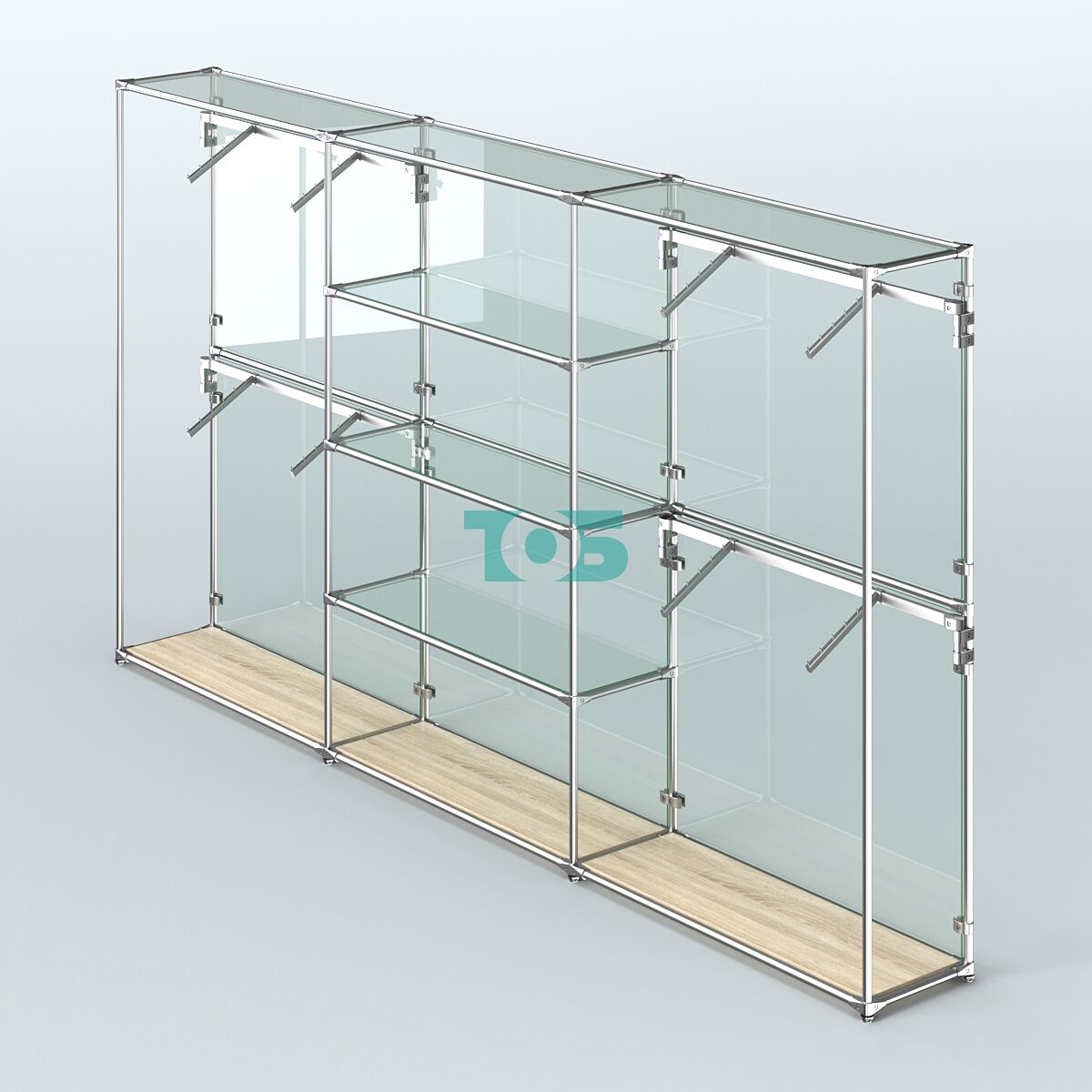 Отличия модели торговой системы ХРОМ (задняя стенка - стекло) 3600 мм с прозрачными полками и поручнями №5: