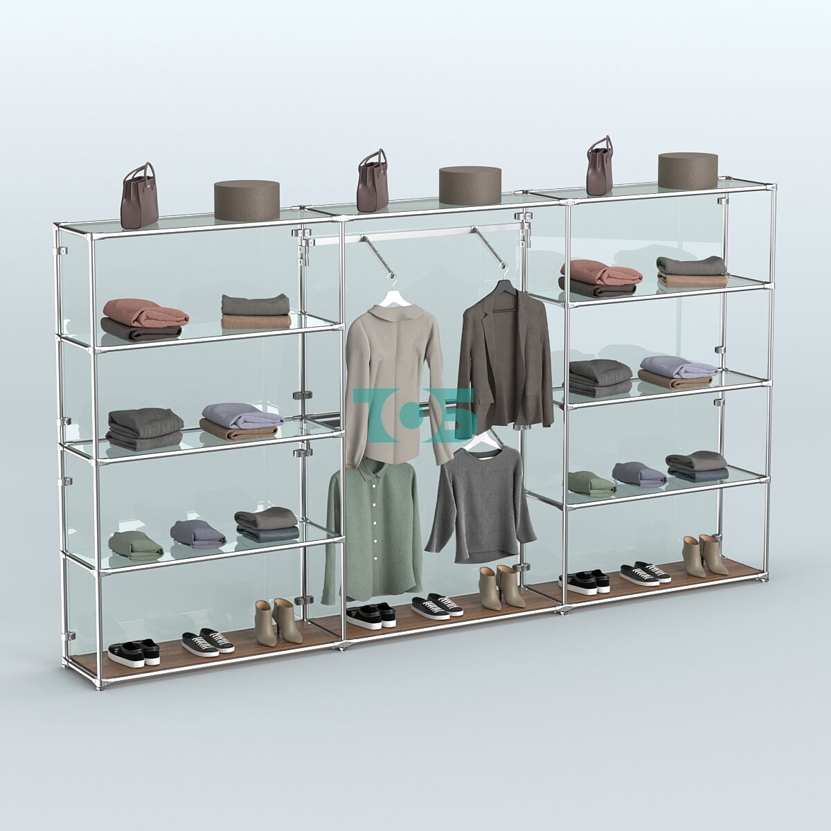 Отличия модели торговой системы ХРОМ (задняя стенка - стекло) 3600 мм с прозрачными полками и поручнями №6: