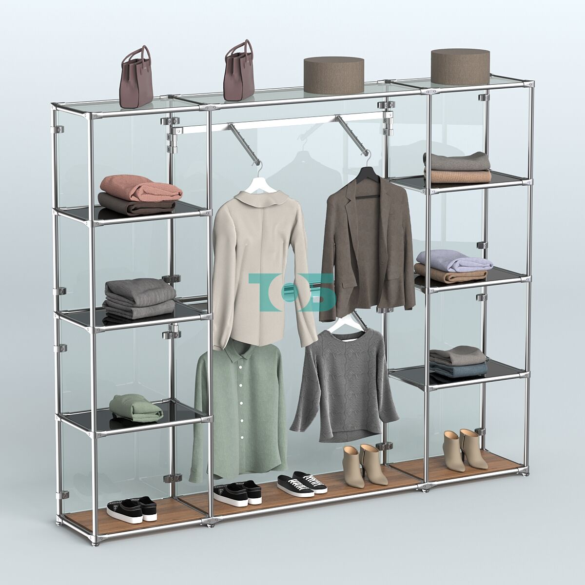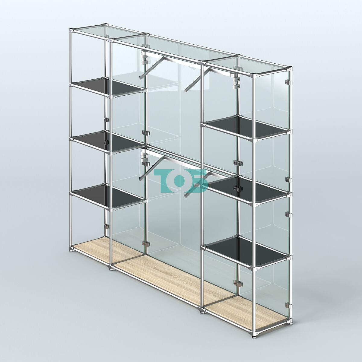 Отличия модели торговой системы ХРОМ (задняя стенка - стекло) 2430 мм с тонированными полками и поручнями №7: