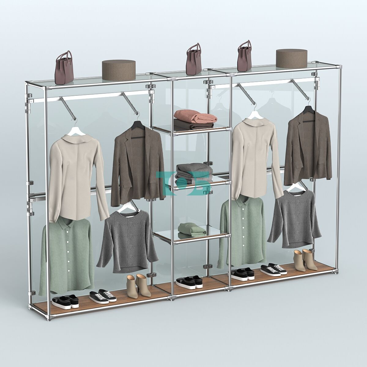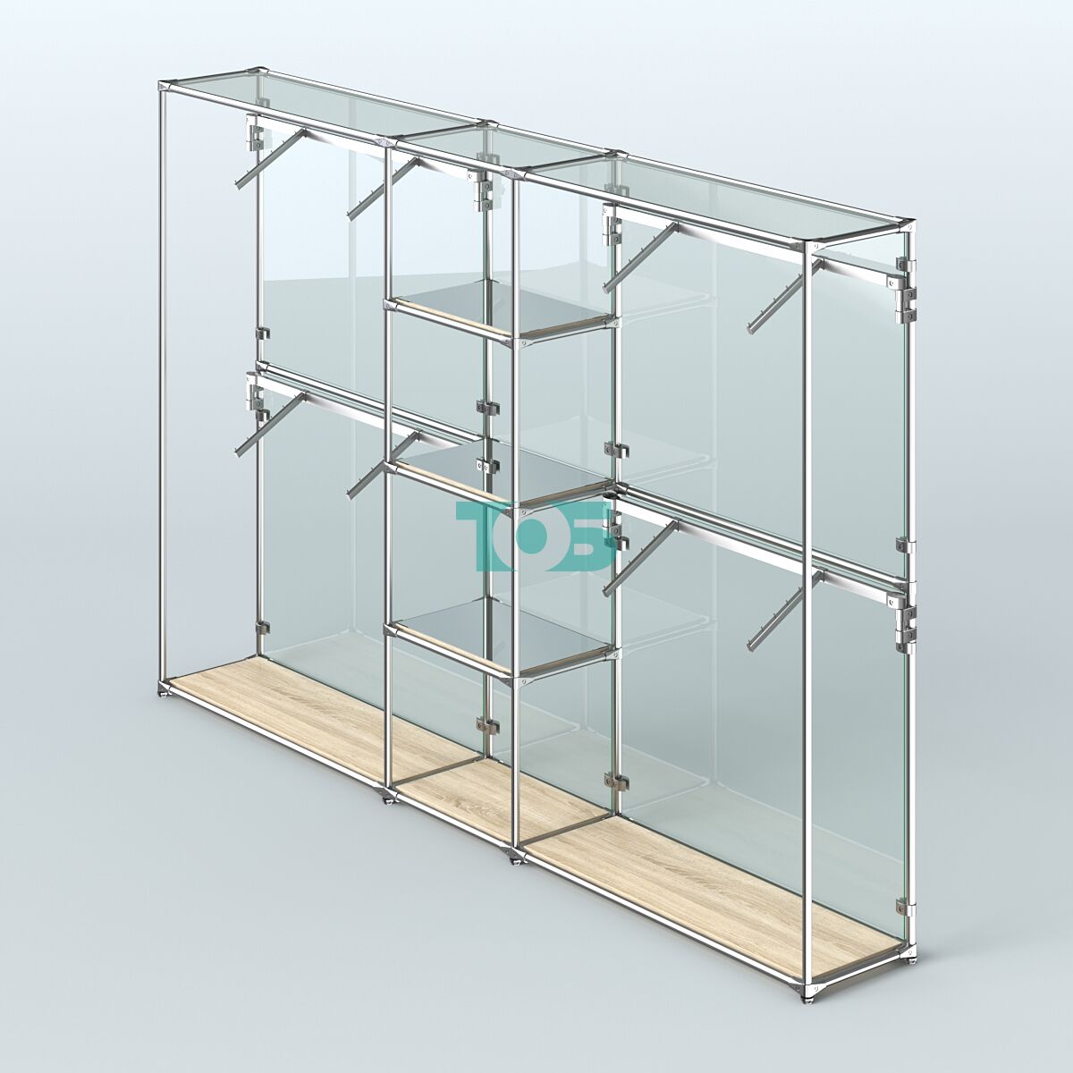 Отличия модели торговой системы ХРОМ (задняя стенка - стекло) 3600 мм с зеркальными полками и поручнями №8: