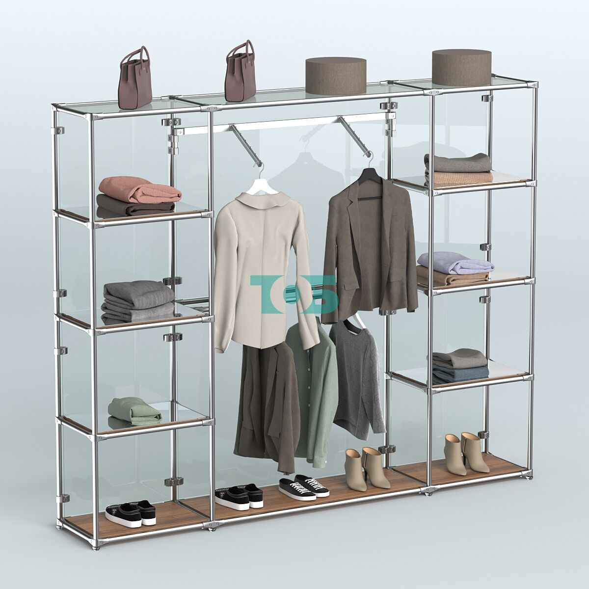 Отличия модели торговой системы ХРОМ (задняя стенка - стекло) 3600 мм с зеркальными полками и поручнями №11: