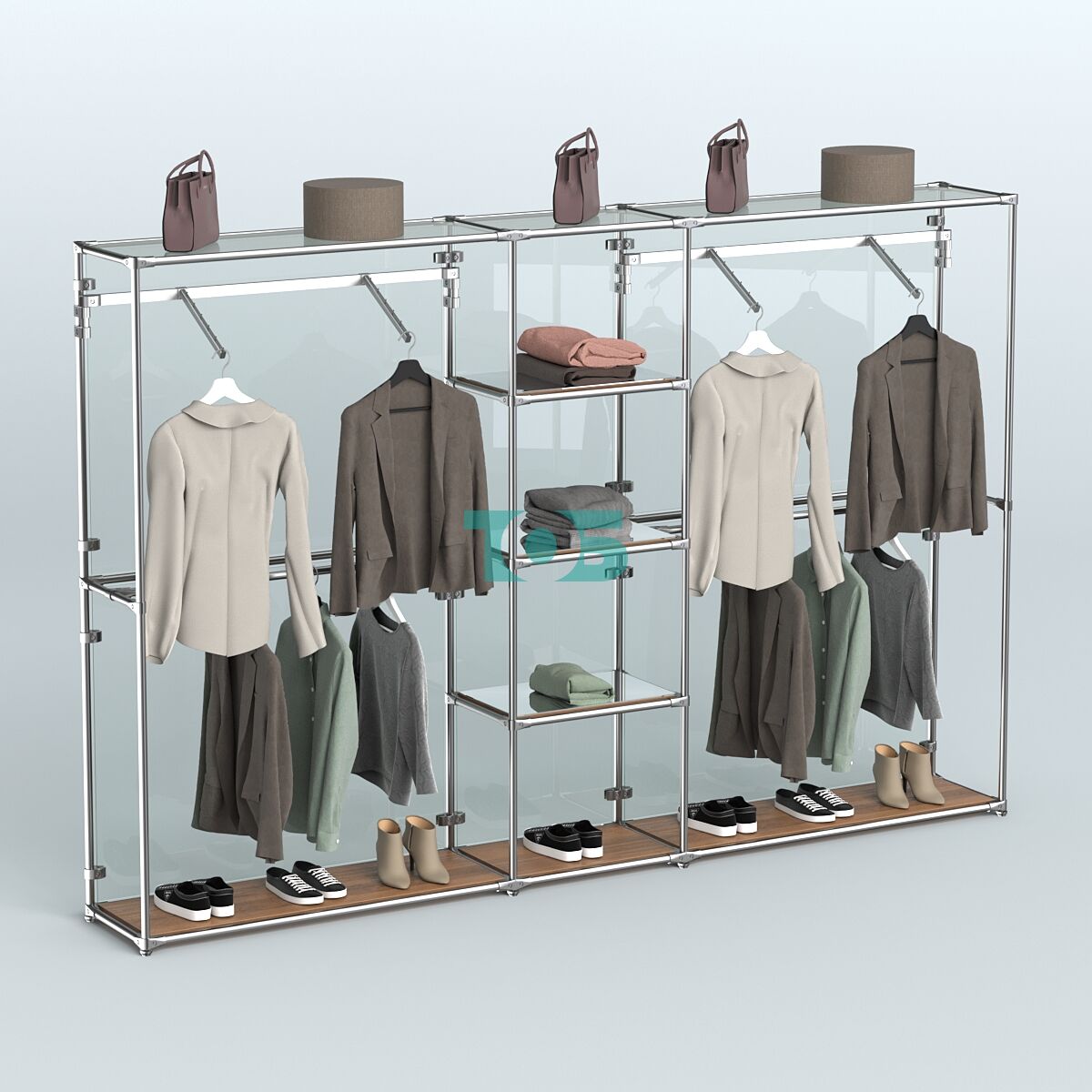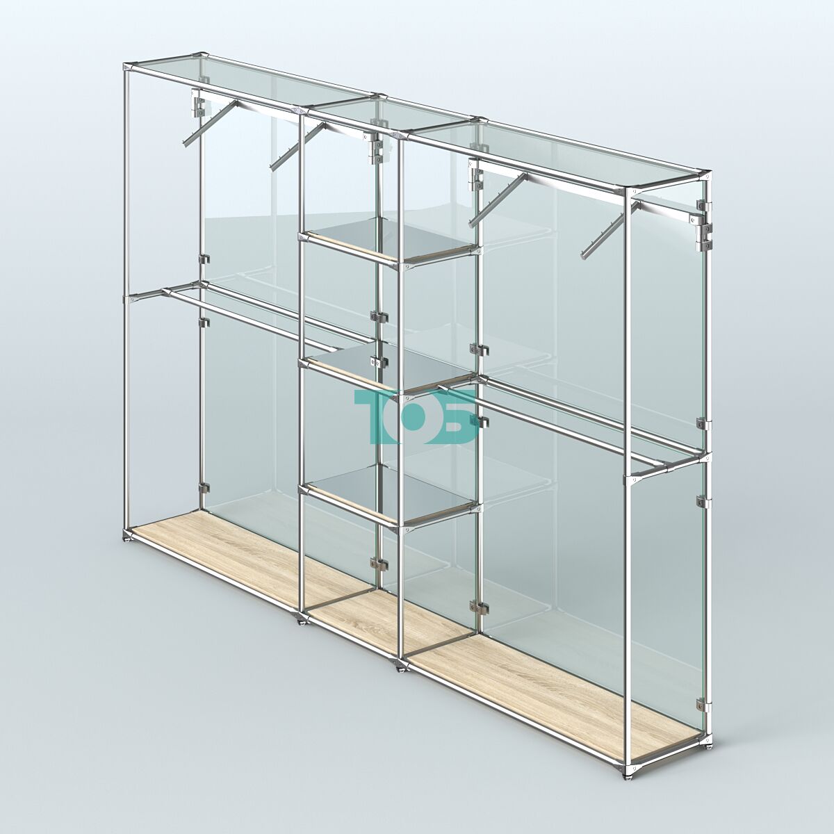 Отличия модели торговой системы ХРОМ (задняя стенка - стекло) 3600 мм с зеркальными полками и поручнями №12: