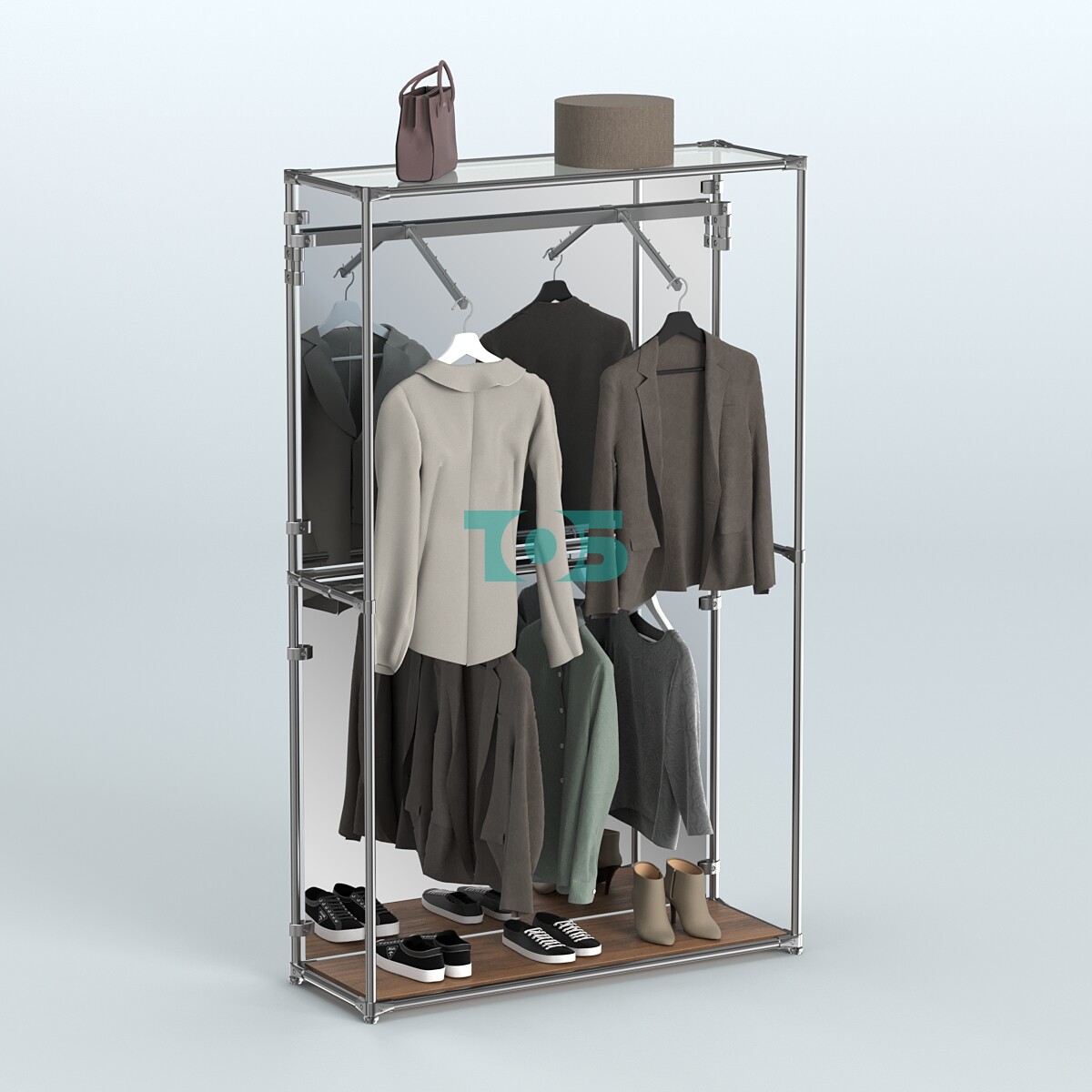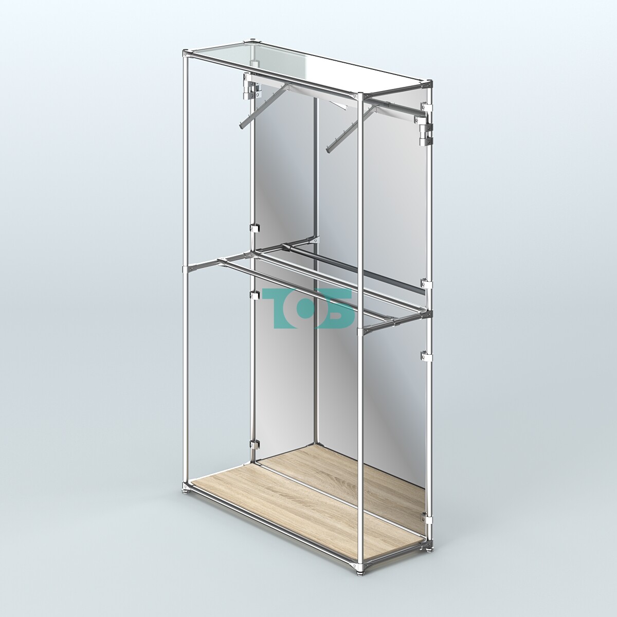 Поручни: включает один пристенный и один продольный поручень для удобства размещения одежды и других предметов, что делает систему многофункциональной.