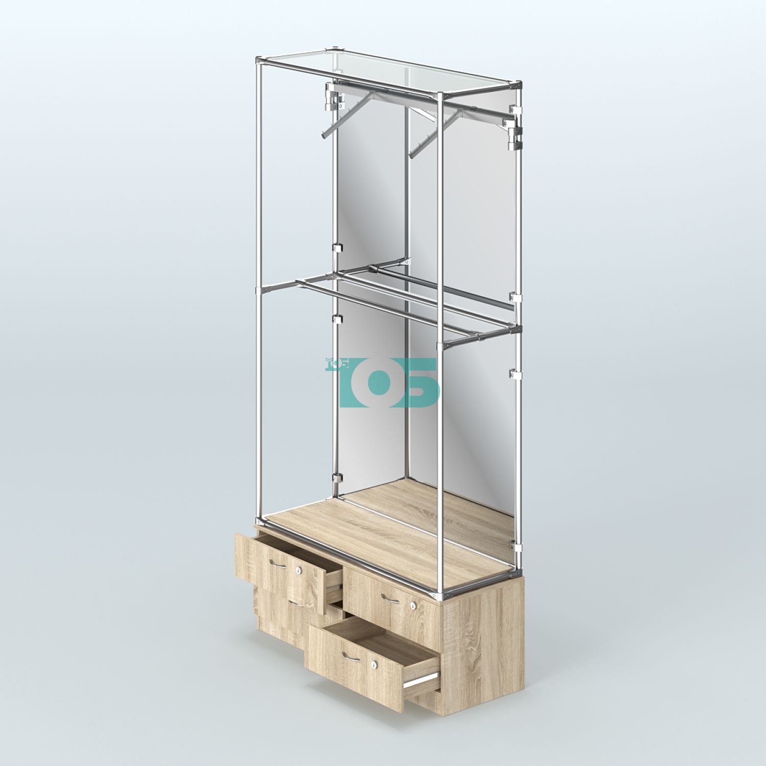 • Торговая система ХРОМ (задняя стенка - зеркало) 1200 мм №4-2 с тумбой Т-14 и поручнями, Дуб Сонома