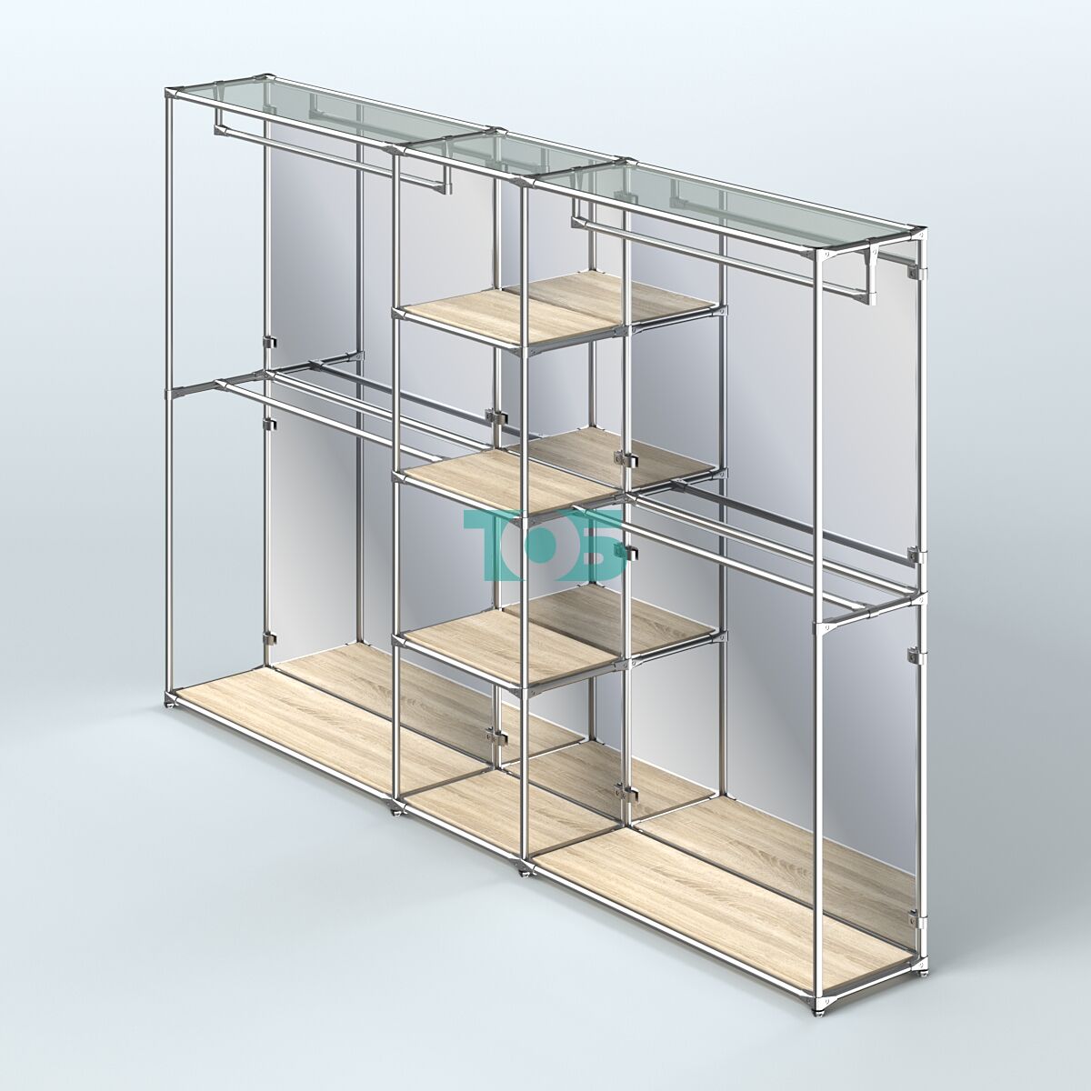 Отличия модели торговой системы ХРОМ (задняя стенка - зеркало) 3030 мм с полками ДСП и поручнями №4: