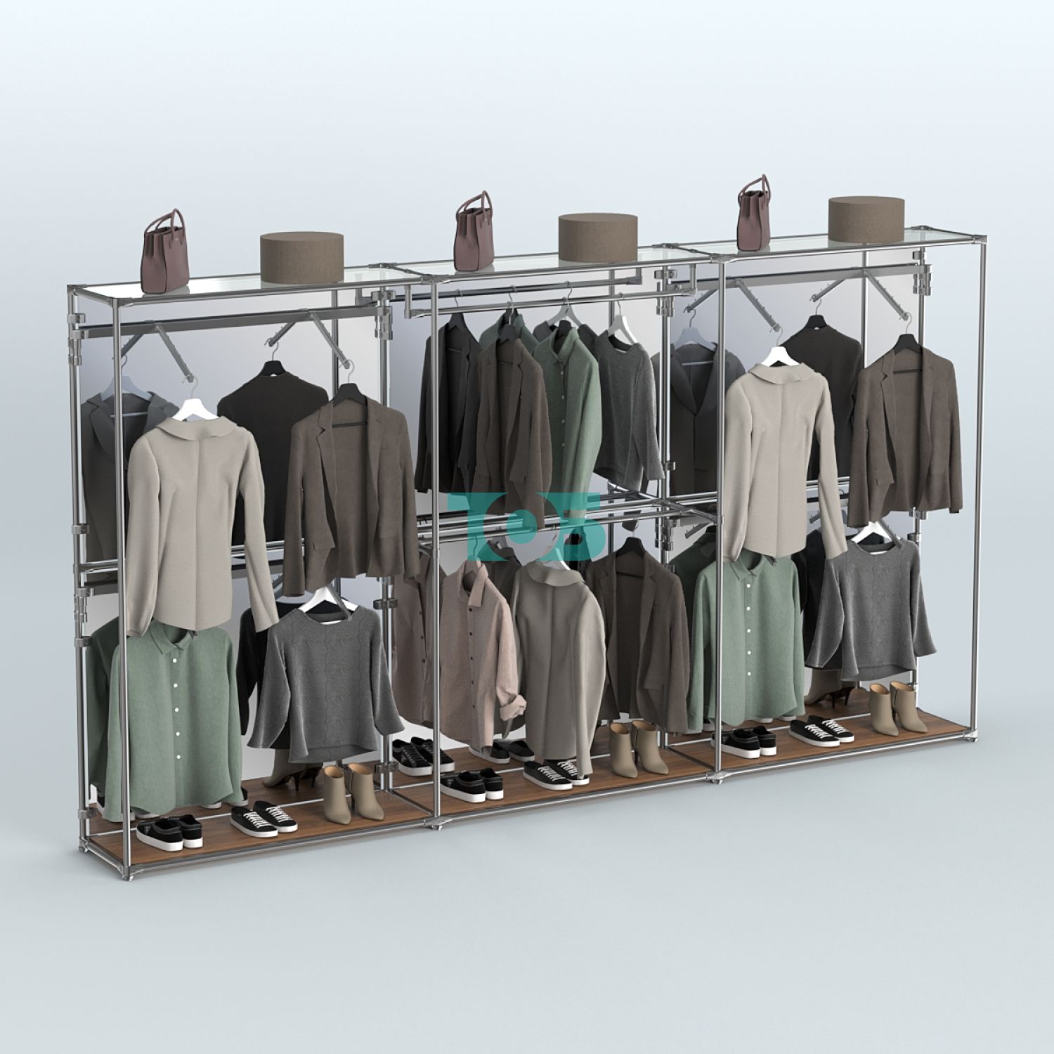 Торговая система ХРОМ с задней стенкой-зеркалом и поручнями №2 представляет собой элегантное и функциональное решение для организации пространства в торговых залах, офисах и других помещениях. Благодаря продуманному дизайну и качественным материалам система обеспечивает удобство использования и долговечность.