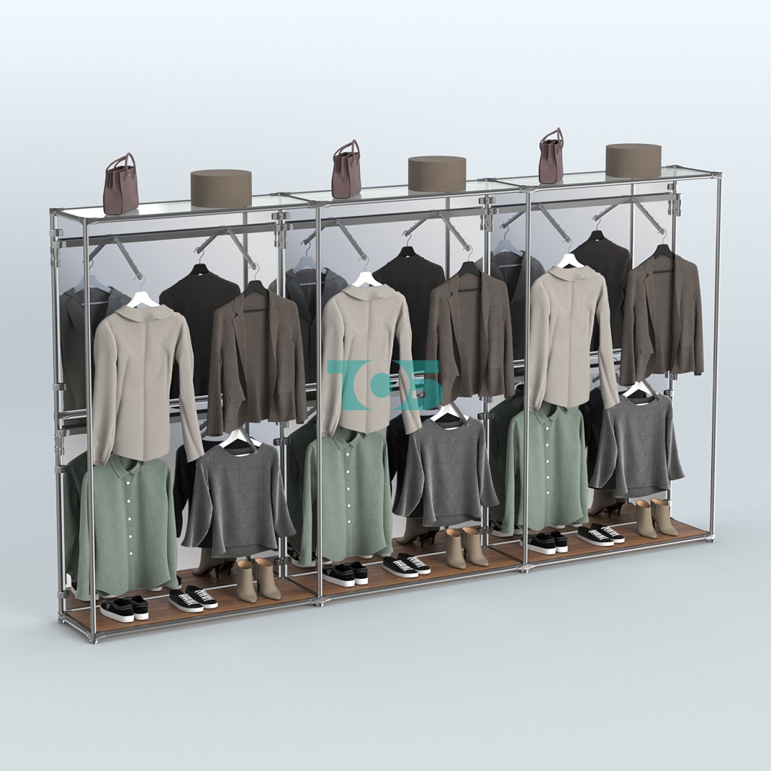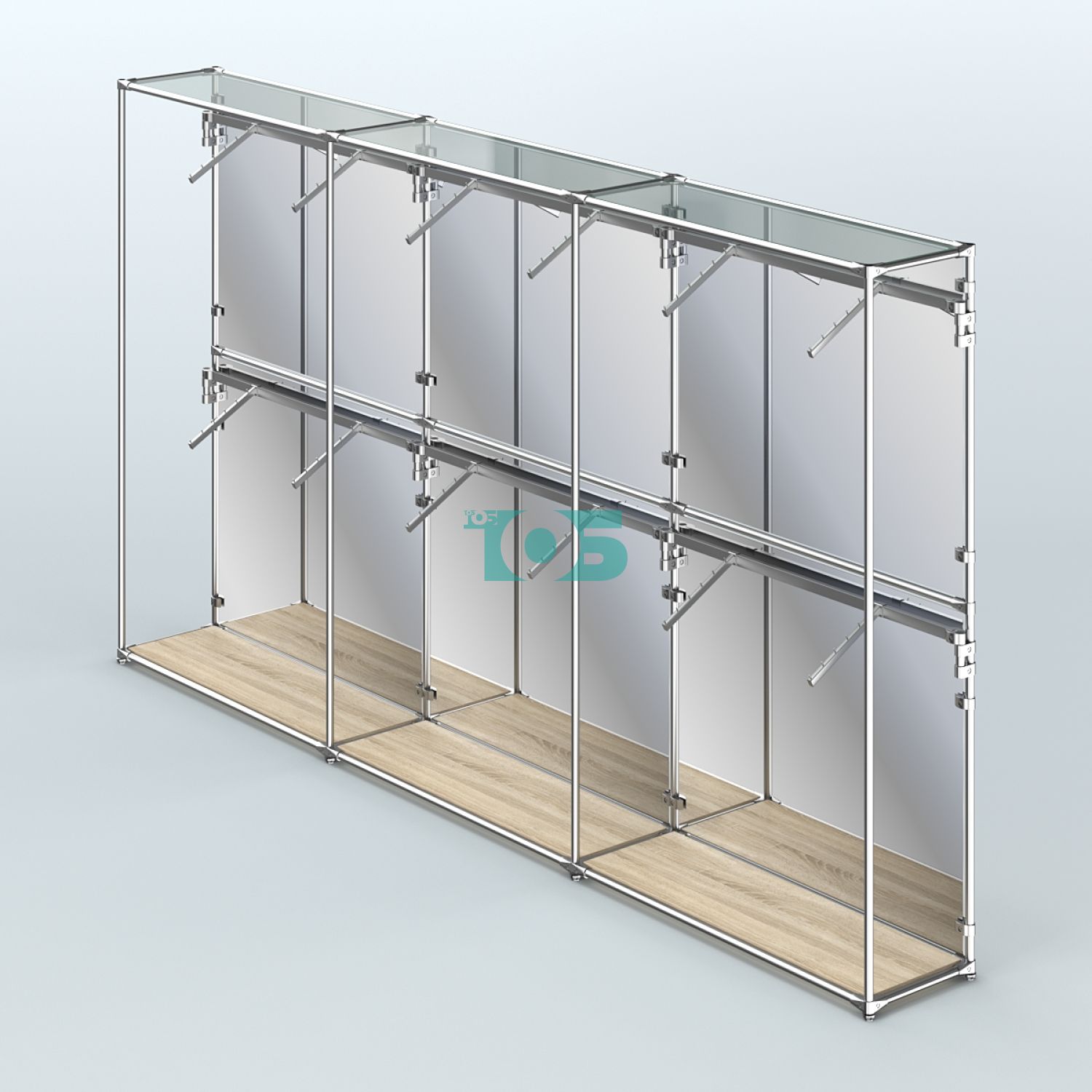 Торговая система ХРОМ с задней стенкой-зеркалом и поручнями №4 представляет собой стильное и функциональное решение для организации пространства в торговых залах, офисах и других помещениях. Благодаря качественным материалам и продуманной конструкции система обеспечивает удобство использования и долговечность.