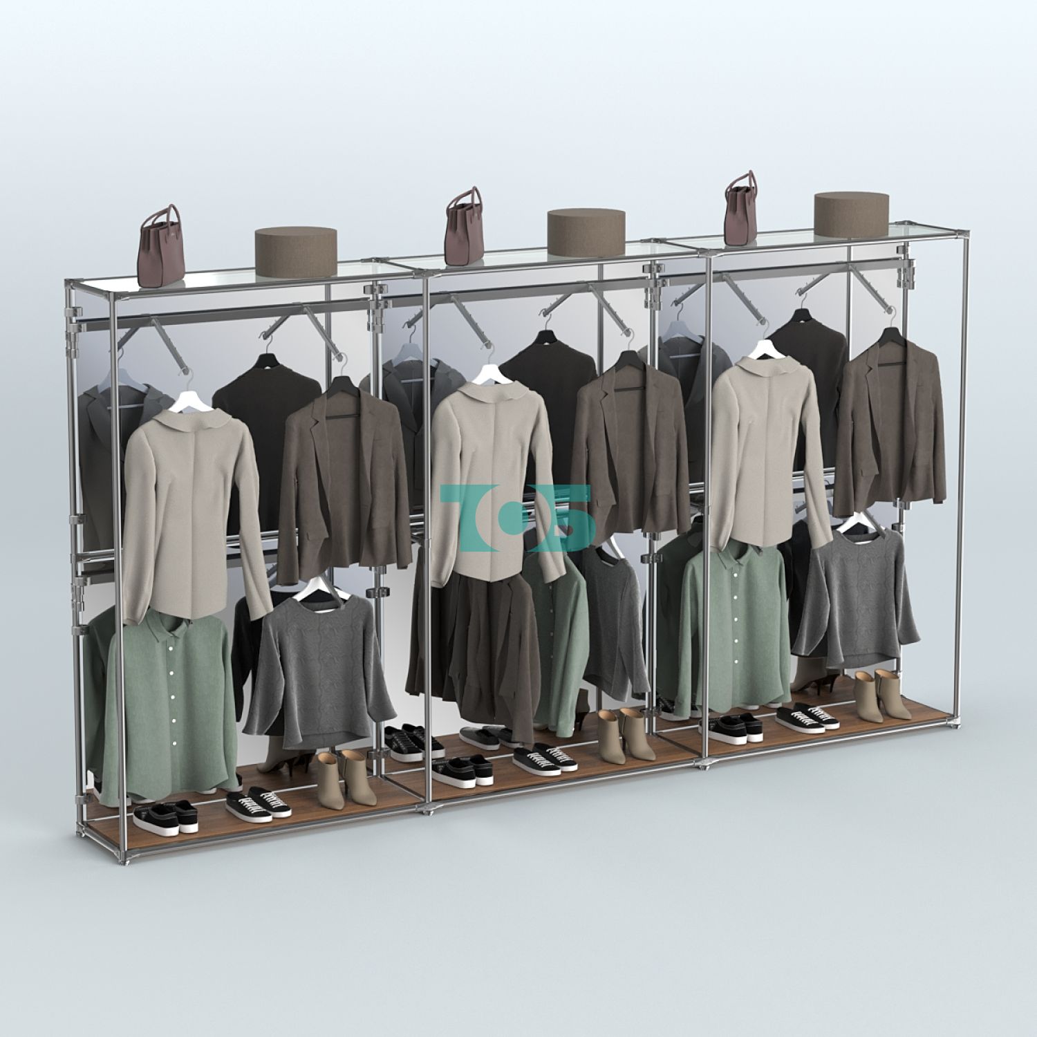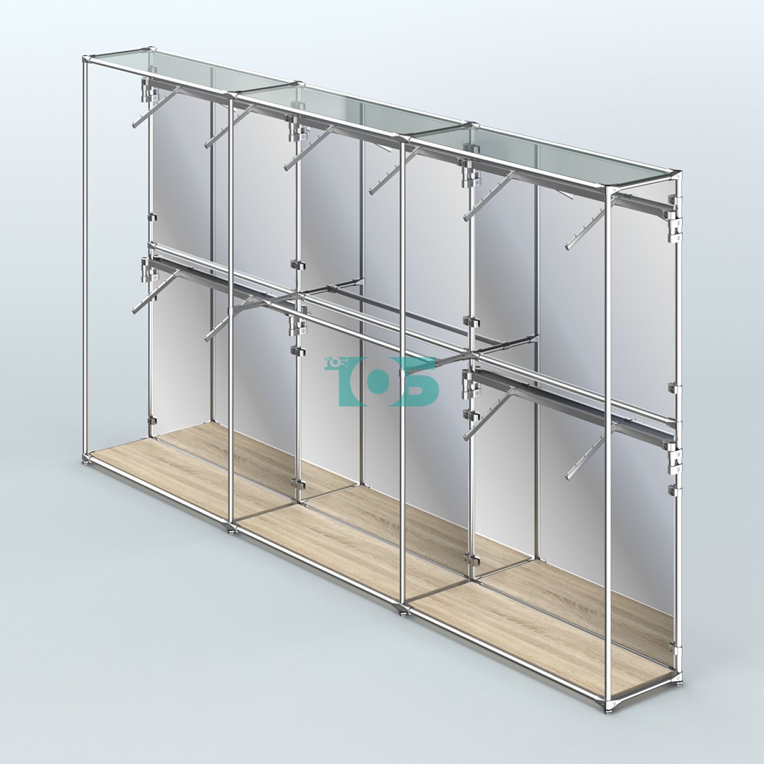 Торговая система ХРОМ с задней стенкой-зеркалом и поручнями №9 представляет собой стильное и функциональное решение для организации пространства в торговых залах, офисах и других помещениях. Благодаря качественным материалам и продуманной конструкции система обеспечивает удобство использования и долговечность.