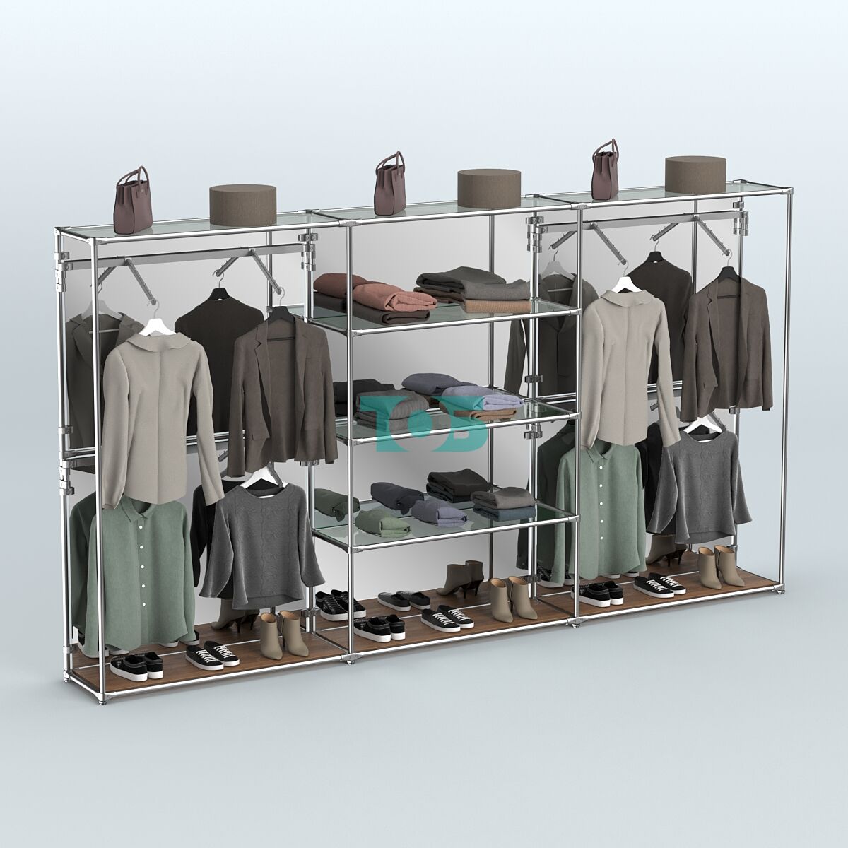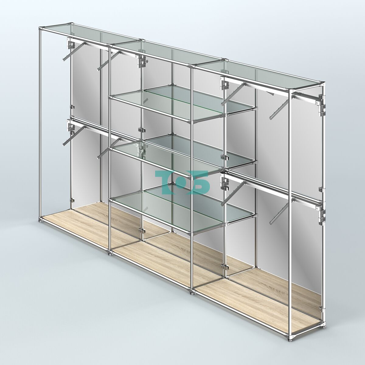 Отличия модели торговой системы ХРОМ (задняя стенка - зеркало) 3600 мм с прозрачными полками и поручнями №5: