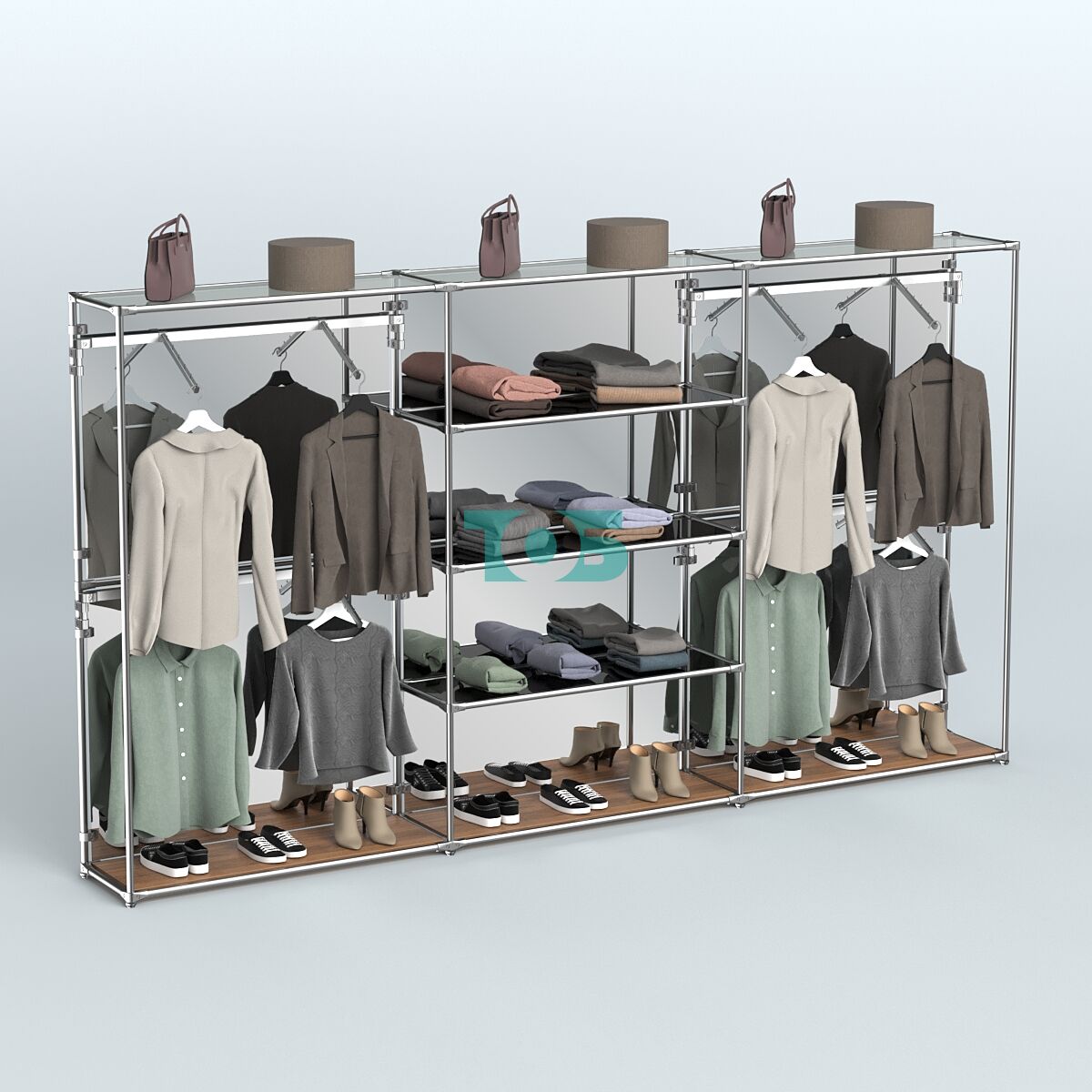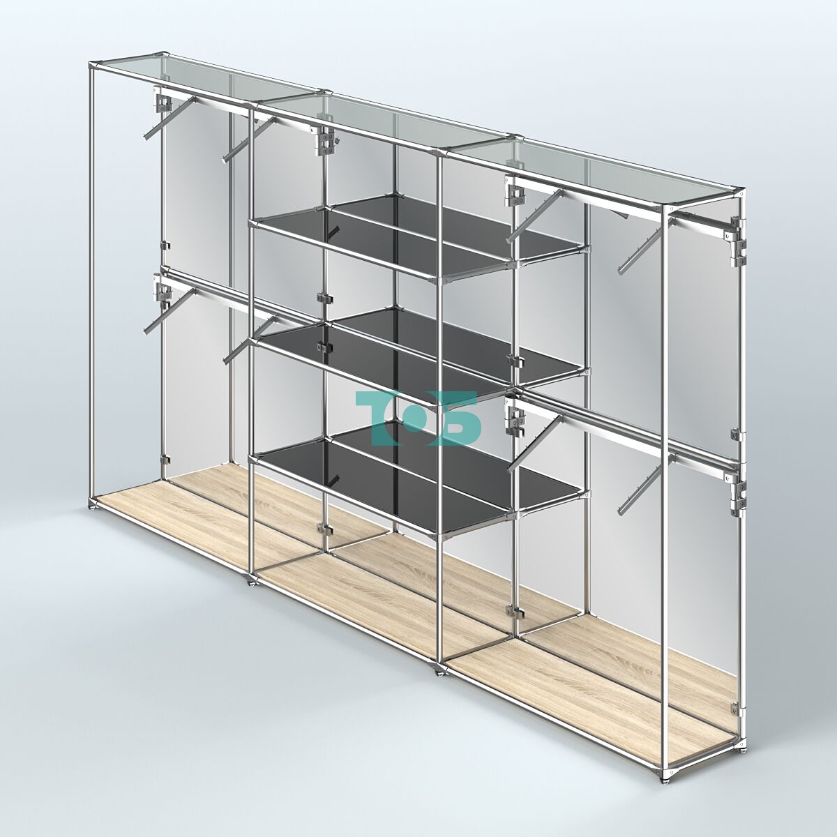 Отличия модели торговой системы ХРОМ (задняя стенка - зеркало) 3600 мм с тонированными полками и поручнями №5: