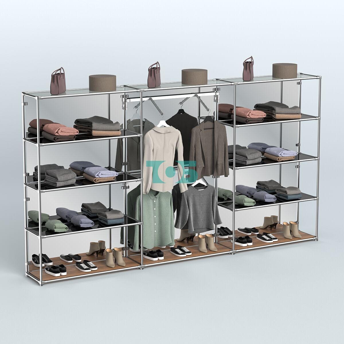 Отличия модели торговой системы ХРОМ (задняя стенка - зеркало) 3600 мм с тонированными полками и поручнями №6: