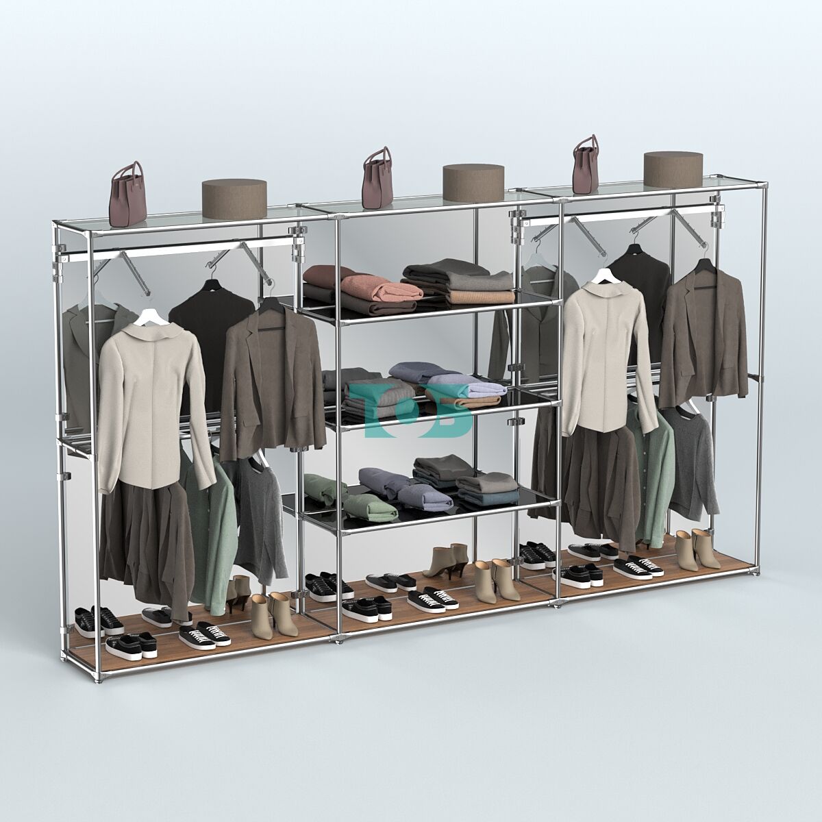 Отличия модели торговой системы ХРОМ (задняя стенка - зеркало) 3600 мм с тонированными полками и поручнями №10: