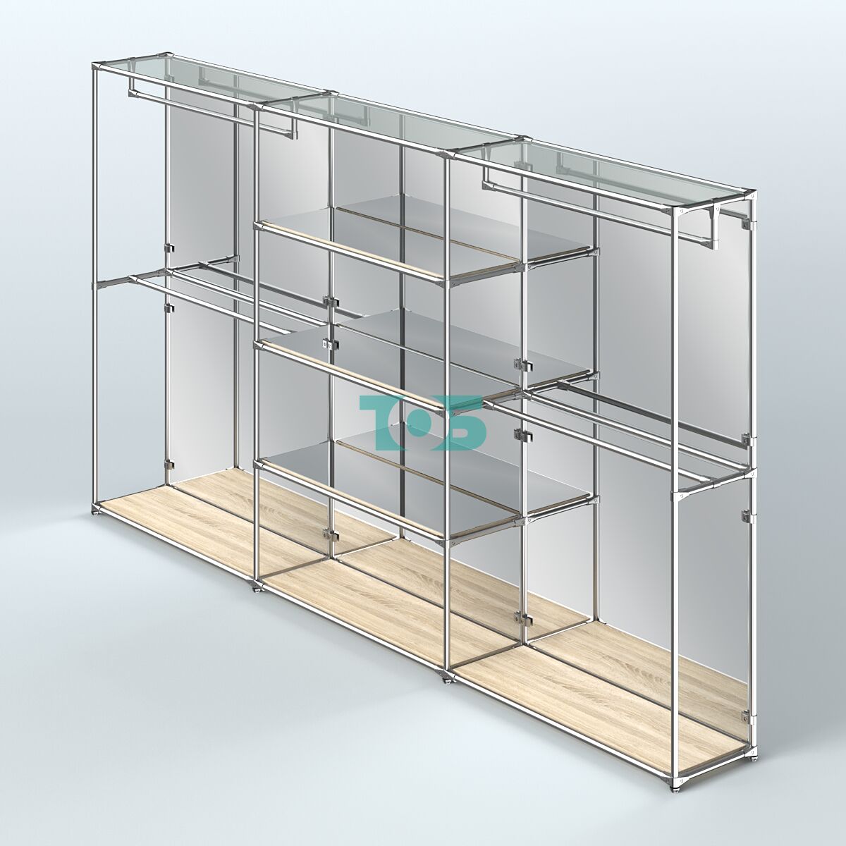 Отличия модели торговой системы ХРОМ (задняя стенка - зеркало) 3600 мм с зеркальными полками и поручнями №2:
